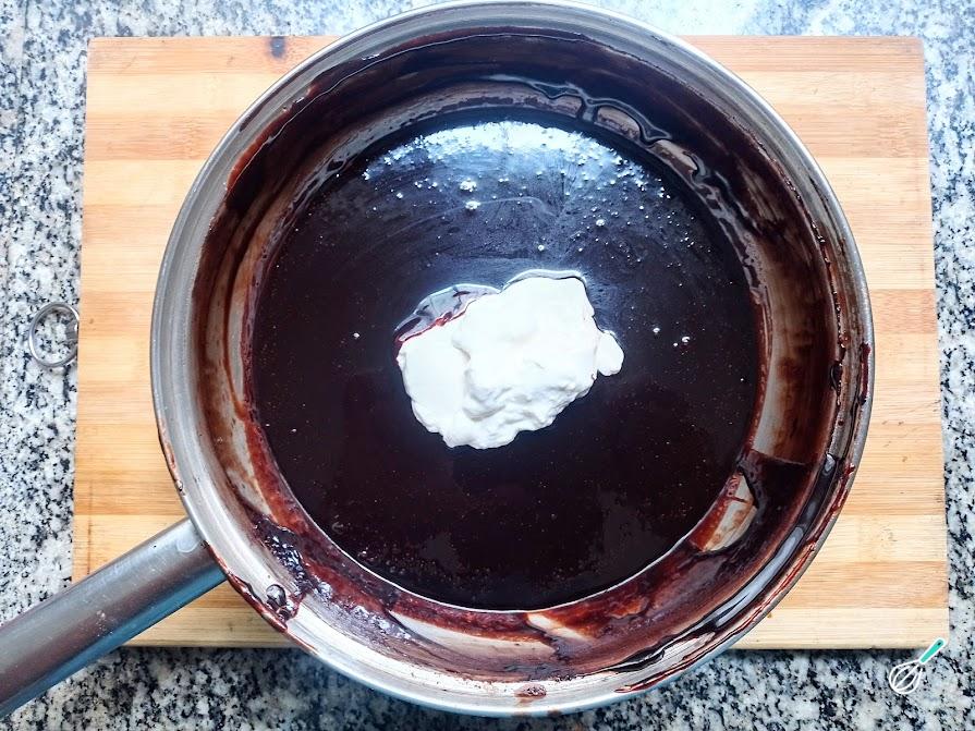 13. Depois de exatos 08 minutos, apos atingir fervura, a calda atingirá o ponto perfeito para cobertura. Neste momento, fora do fogo, adicione metade de uma caixinha de creme de leite.