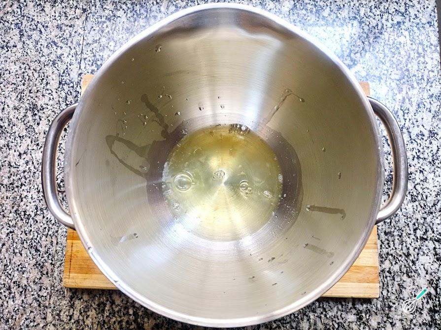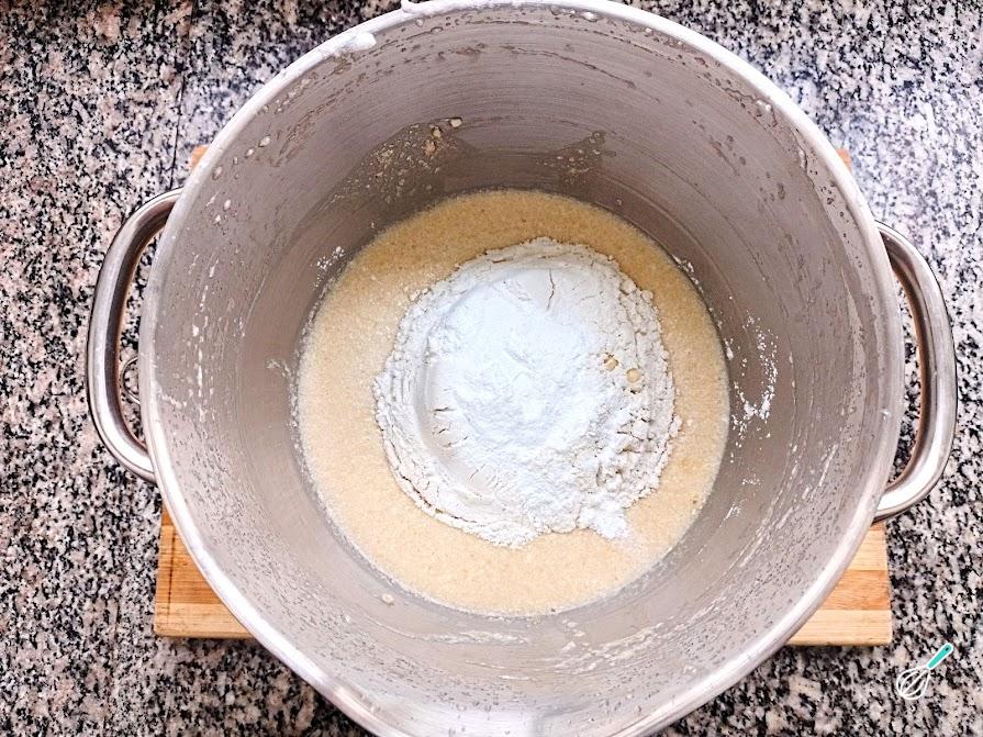4. Após reservar as claras, na mesma tigela da batedeira (não precisa lavar), adicione o açúcar e as gemas.