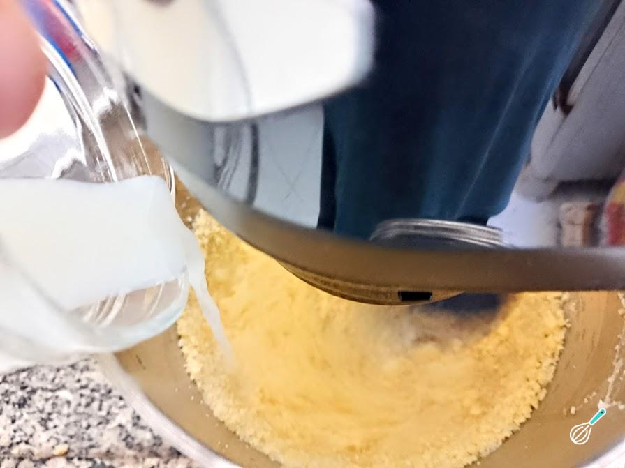 5. Na batedeira, quando esses dois ingredientes atingirem o aspecto de "farofa" ir colocando o leite aos poucos, em fio, sem desligar a batedeira.