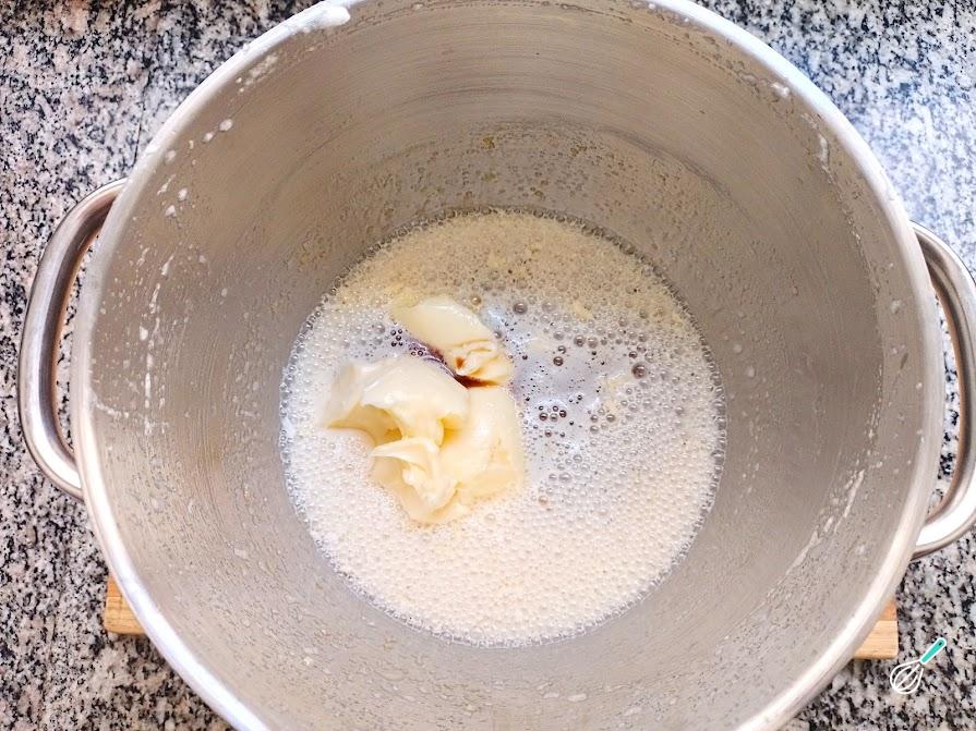 6. Quando a mistura atingir um ponto mais claro, pode desligar a batedeira, para colocar a manteiga, que deve estar em ponto pomada, ou seja, temperatura ambiente.