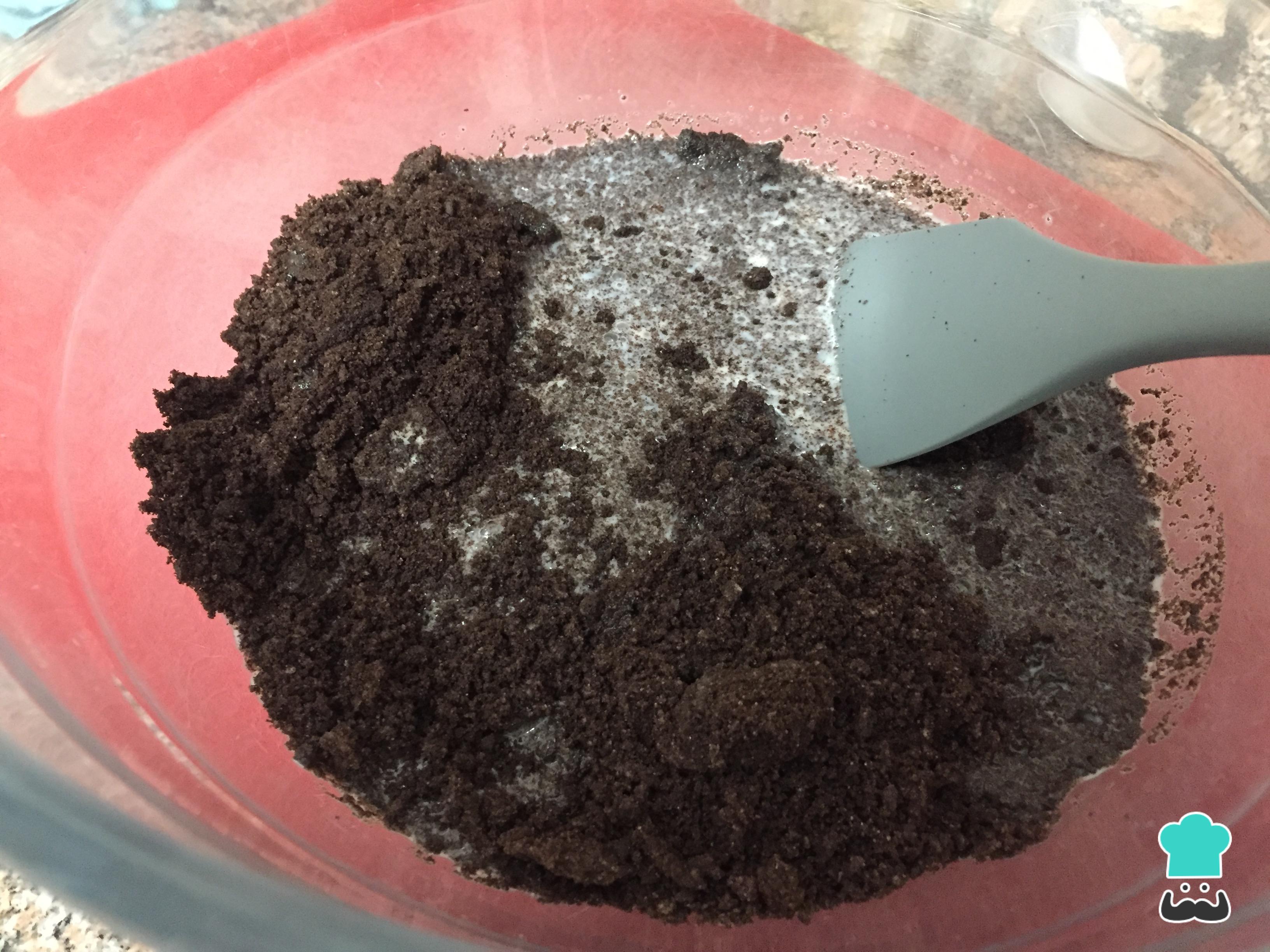 Transfira a farofa de biscoito Oreo para uma tigela, adicione o leite e mexa até envolver bem. Se a massa deste bolo de Oreo ficar muito espessa, acrescente um pouco mais de leite; se estiver muito mole, acrescente mais alguns biscoitos processados.