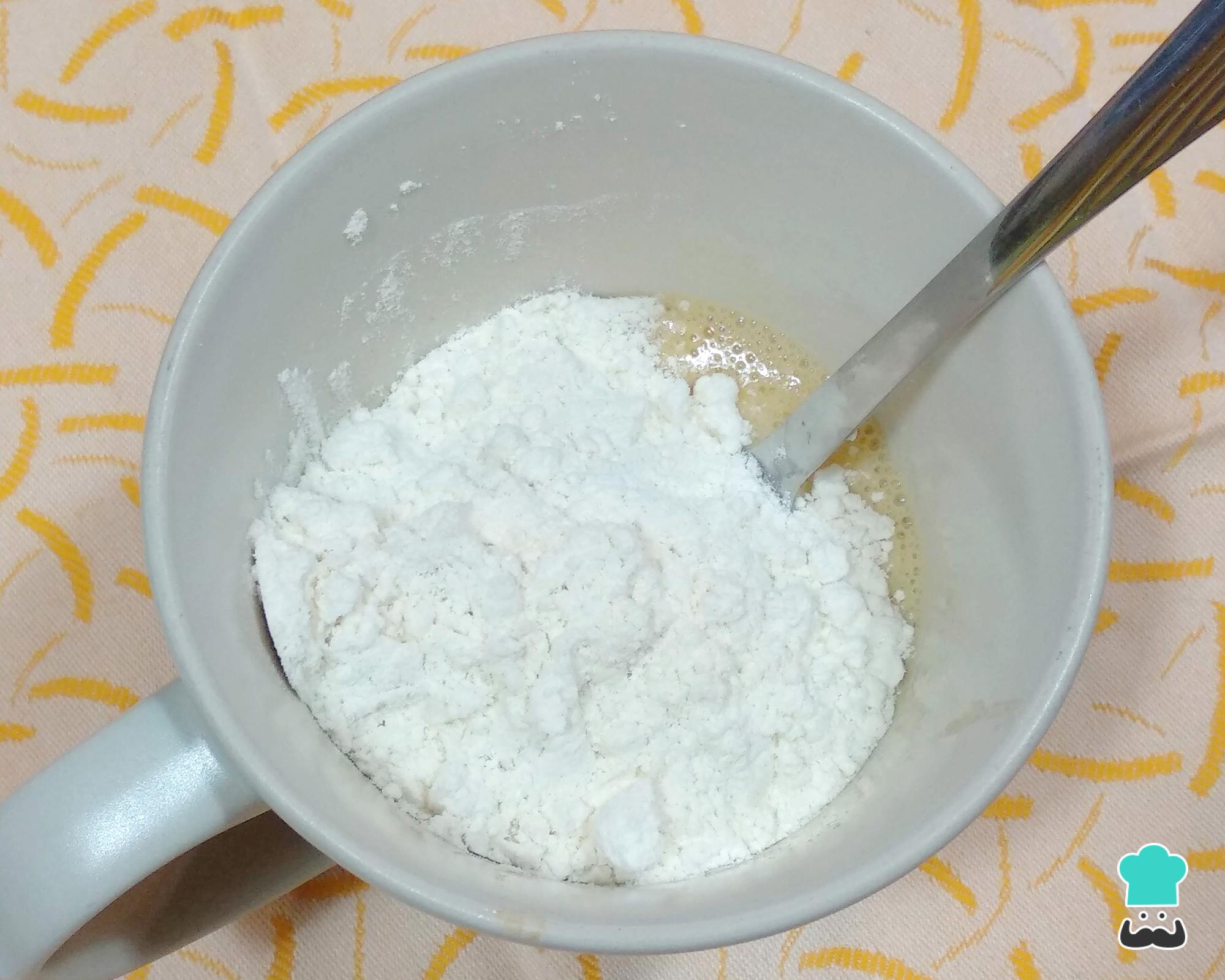 Coloque a farinha e o açúcar misture novamente usando um garfo. Nesta receita de bolinho de banana de caneca você pode usar farinha de trigo branca ou farinha de trigo integral, como preferir.