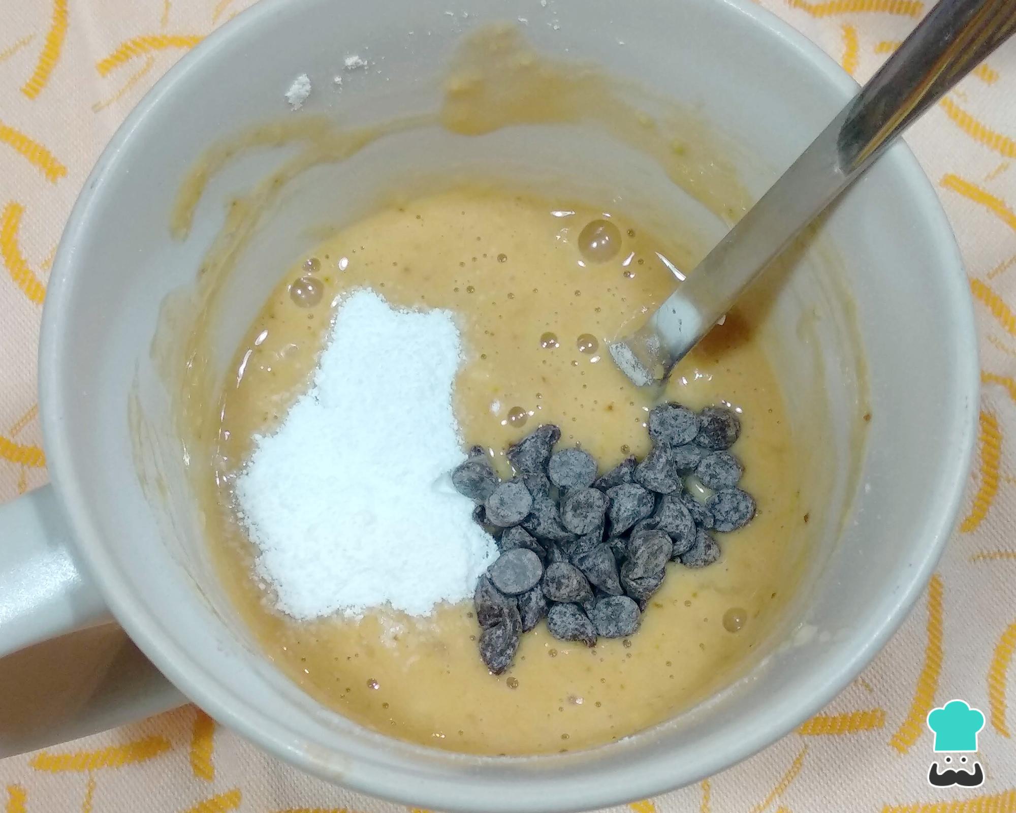 Por fim coloque o fermento e, se quiser, adicione também algumas gotas de chocolate ou chocolate picado para conseguir um bolo de banana mais gostoso. Misture bem.