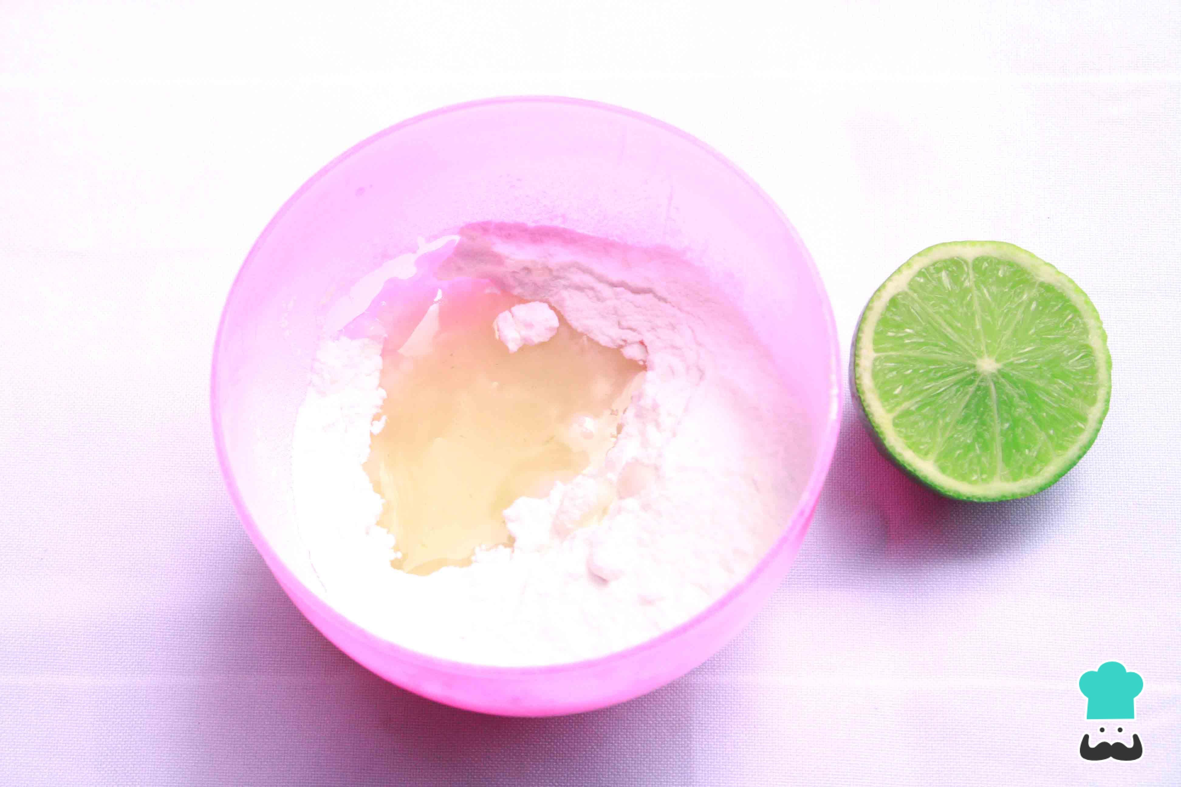 Enquanto isso, prepare a cobertura do bolo de limão (glacê de limão) simplesmente misturando o açúcar de confeiteiro com o suco de limão. Mexa bem até obter uma consistência pastosa, que poderá ser mais líquida se adicionar mais suco.