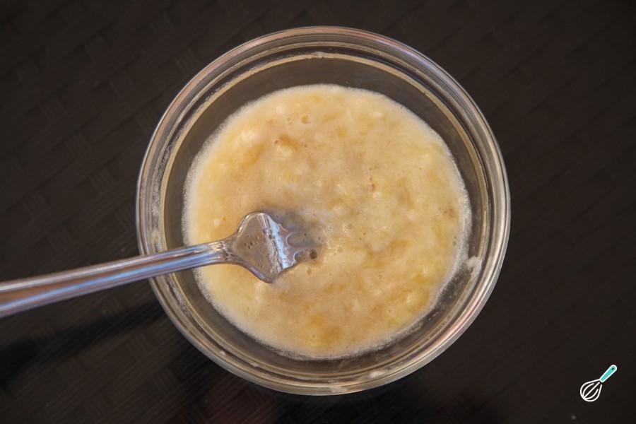 É bem fácil preparar essa receita de bolo de caneca! Comece por amassar a banana e misturar em uma tigela com o ovo e o mel.