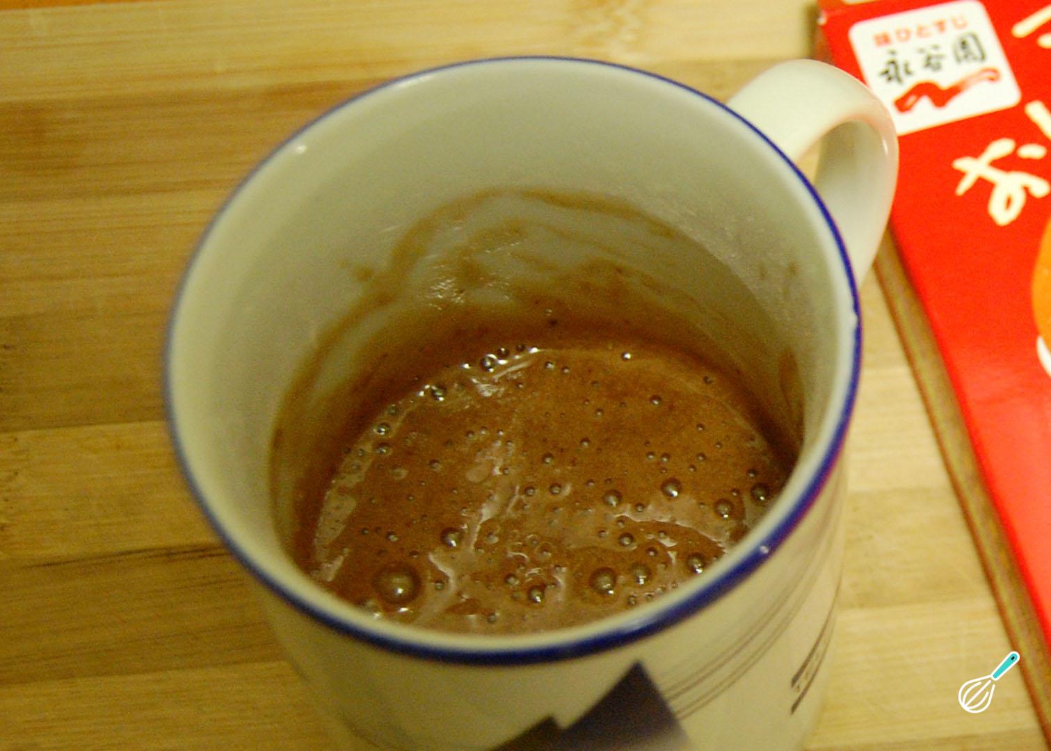 Acrescente os restantes ingredientes e misture muito bem, para que não restem grumos de cacau nem de fermento. Coloque numa caneca untada.