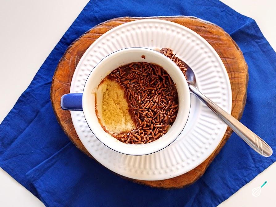 Seu bolo de caneca simples branco está pronto! Se quiser dar um toque extra de sabor, você pode finalizar com uma calda de chocolate ou geleia de sua preferência. Nos conte o que achou dessa receita nos comentários e poste suas fotos!