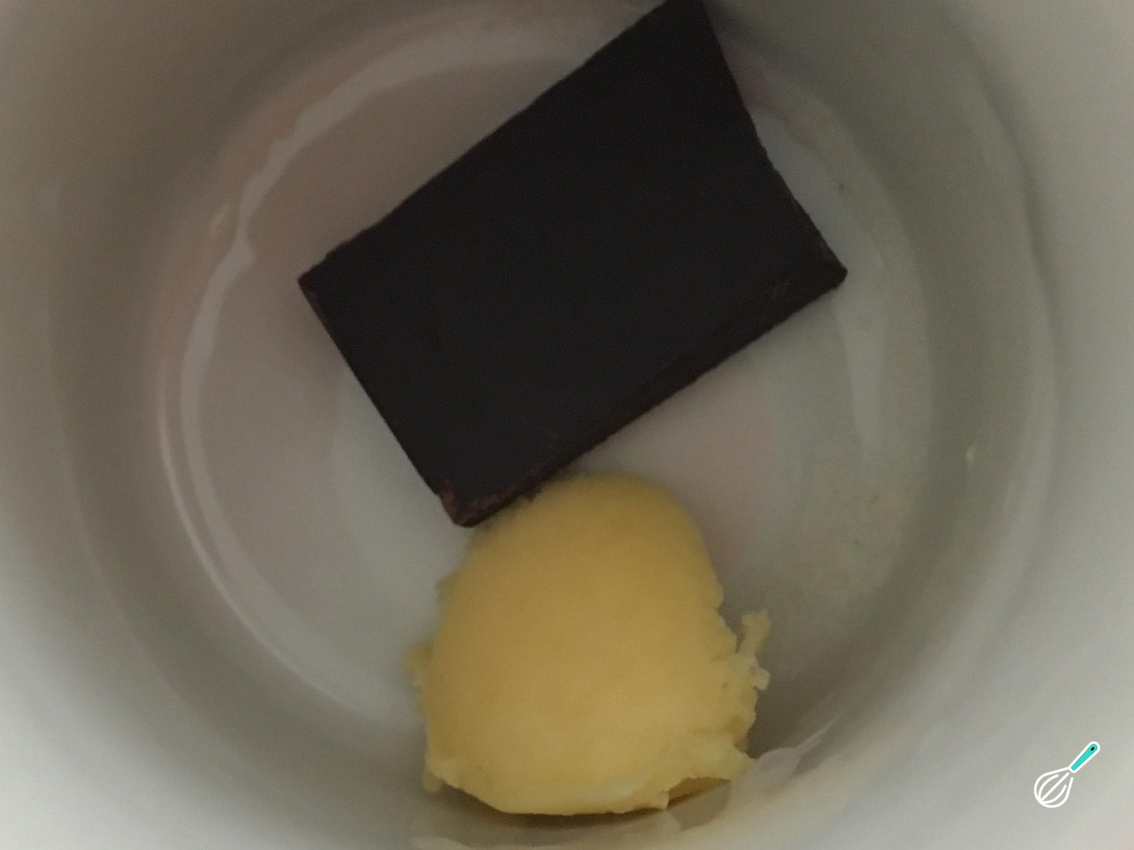 Numa caneca coloque a manteiga e um quadrado de chocolate e leve para o microondas por 45 segundos, em potência alta.