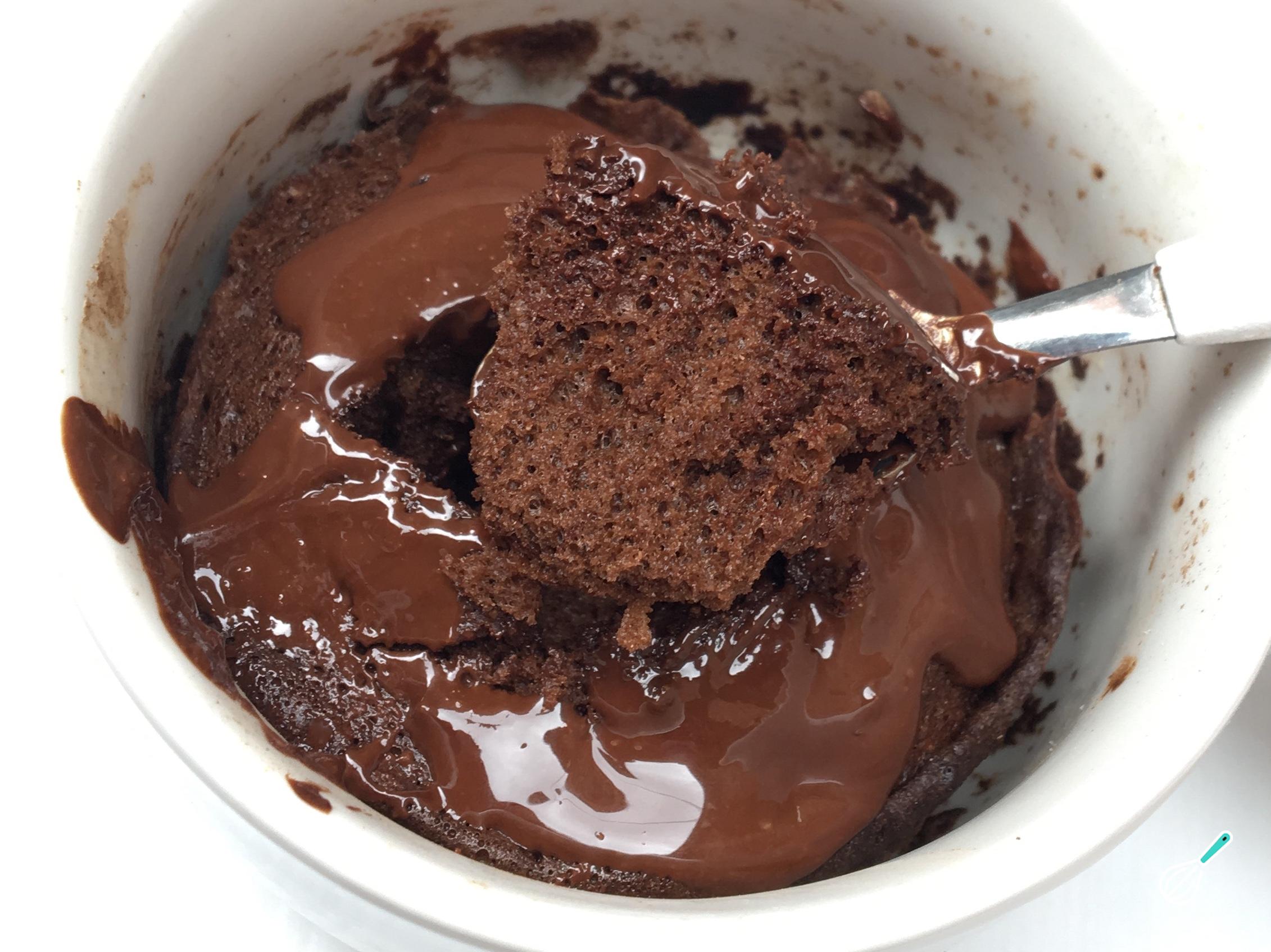 Por fim finalize seu bolo de caneca low carb de chocolate com o outro quadrado de chocolate derretido e está pronto! Deixe esfriar um pouco antes de se deliciar com este lanche rápido e saudável, perfeito para os mais gulosos.
