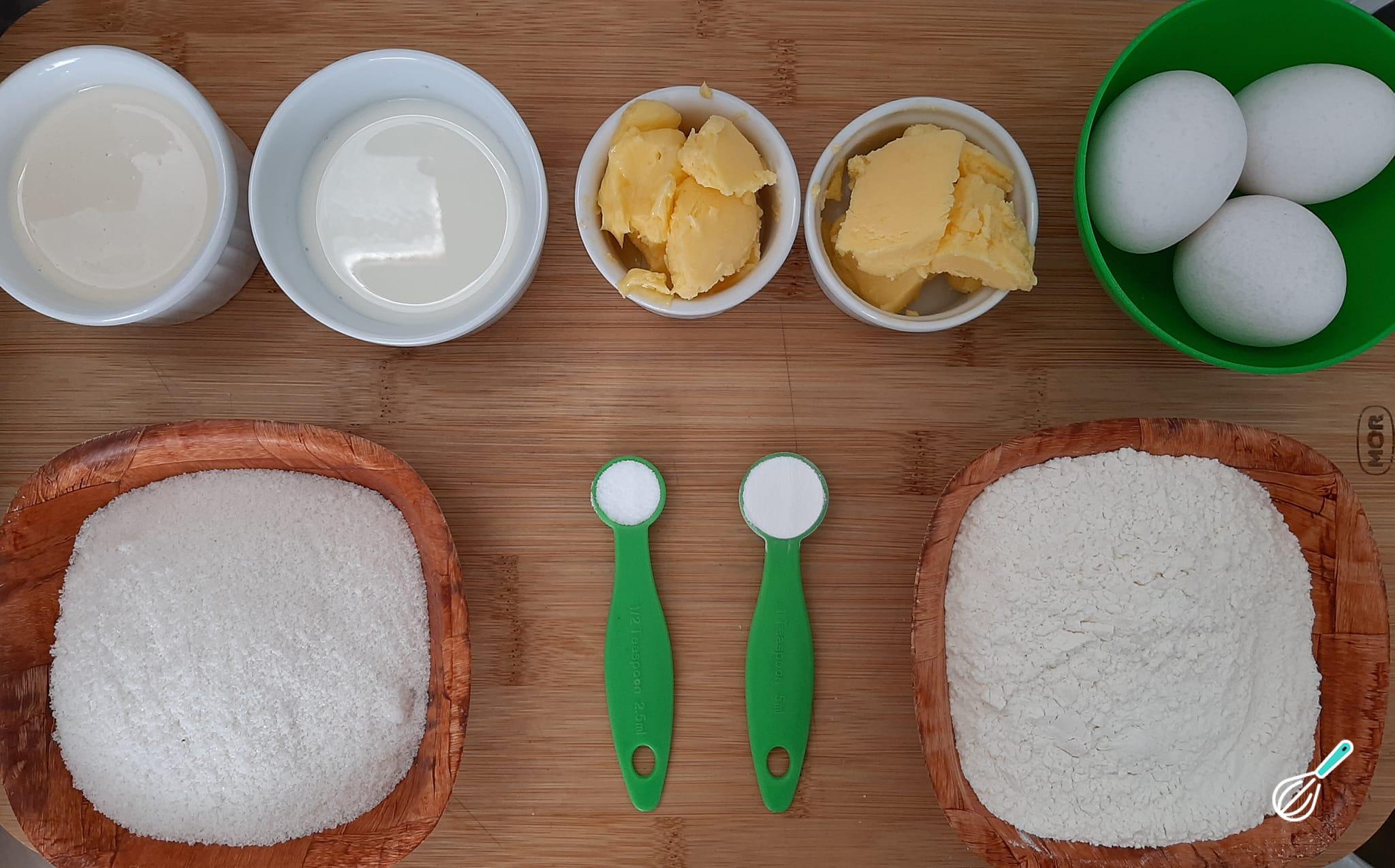Separe os ingredientes necessários para preparar o bolo de caramelo salgado, que será dividido em 2 etapas: caramelo e massa de bolo.