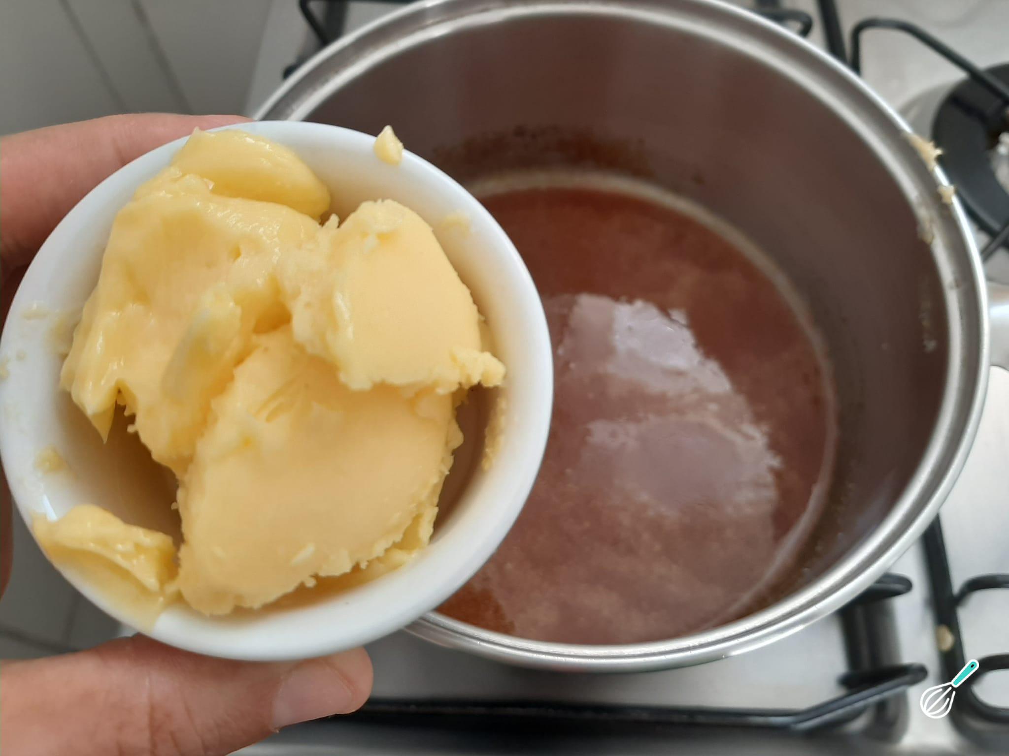Numa panela média alta, derreta o açúcar em fogo médio até virar caramelo. Adicione 50 gramas de manteiga na panela e misture com uma colher.