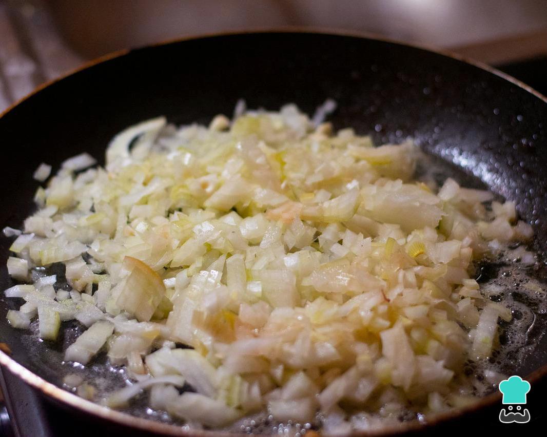 Preaqueça o forno nos 190-200ºC e leve ao fogo uma frigideira com o óleo ou azeite. Quando o óleo estiver quente adicione a cebola picada e refogue por 2-3 minutos, mexendo de vez em quando, até ficar macia e começar a dourar.