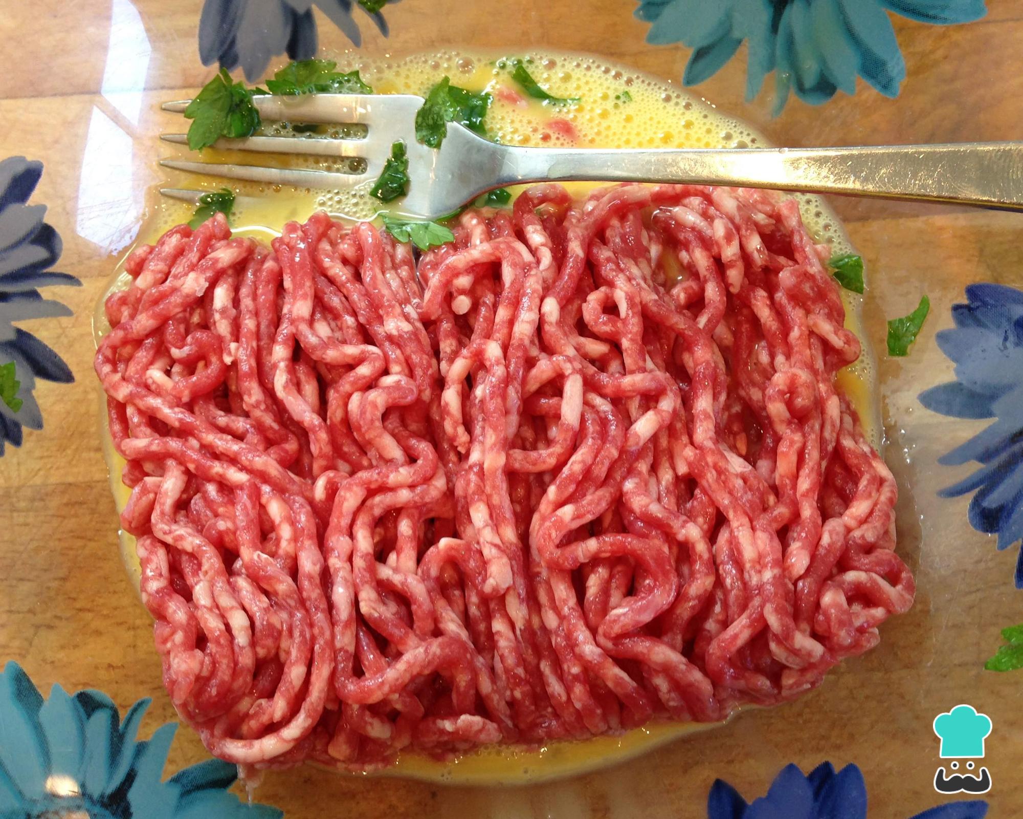 Bata o ovo num bowl e adicione a cebola refogada e os restantes ingredientes: o shoyu ou molho inglês, a aveia, metade do molho de tomate ou molho barbecue, a salsinha, o sal e a carne moída. Misture tudo com as mãos até obter uma massa de carne moída consistente.