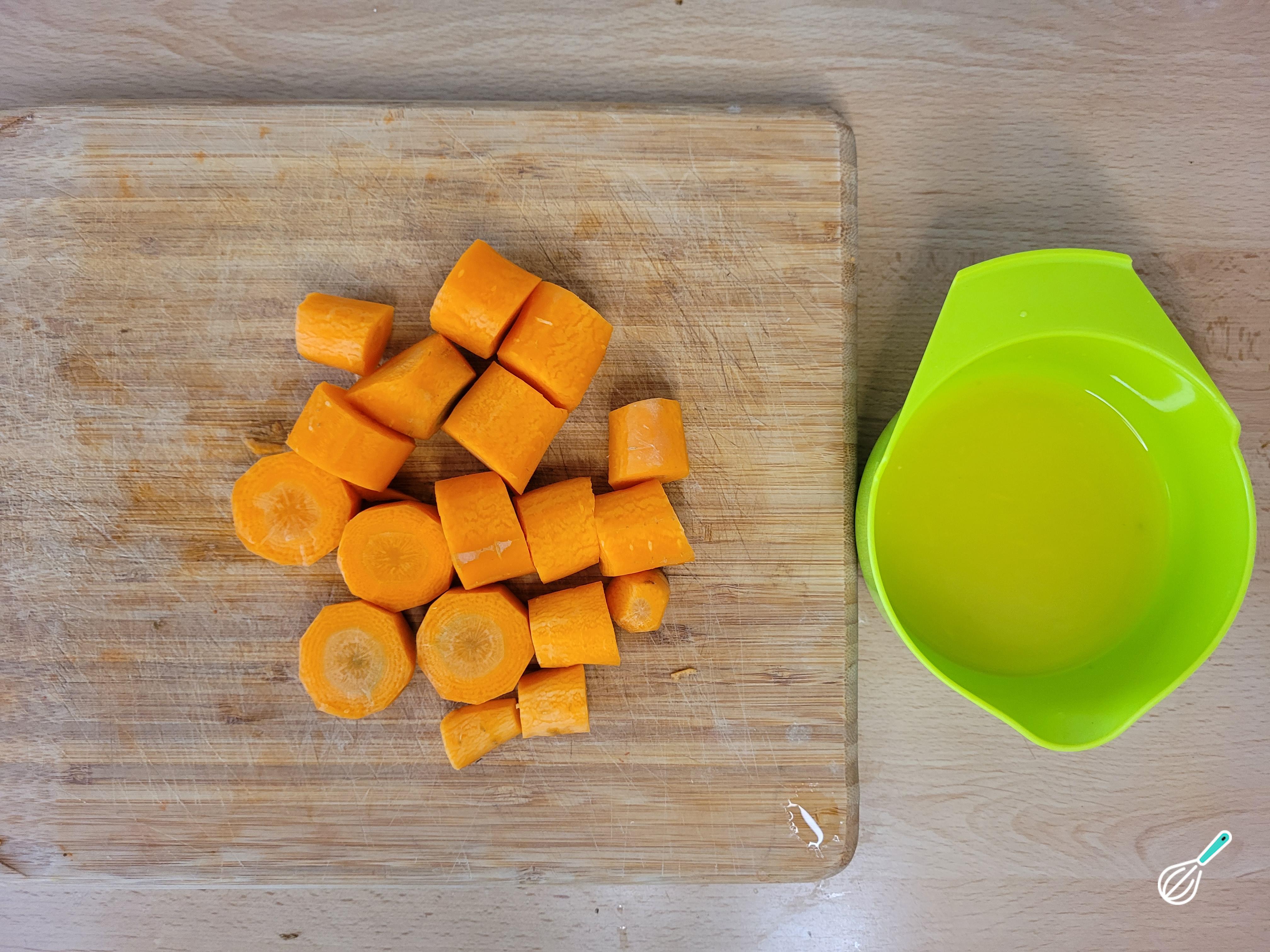 Descasque e corte a cenoura em pedaços e esprema a laranja.