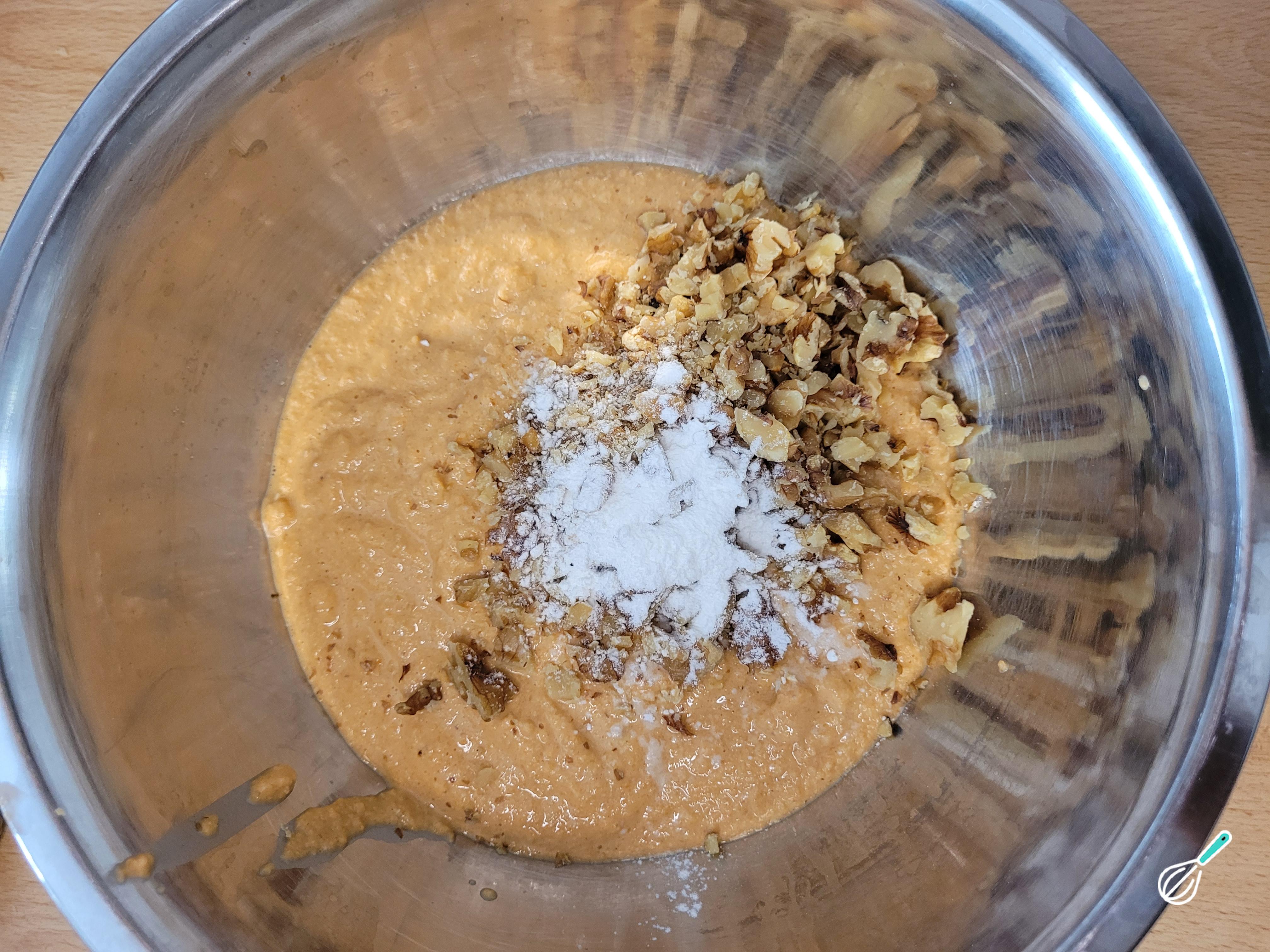 Em um liquidificador, coloque todos os ingredientes menos o fermento e as nozes e bata até ter uma massa homogênea.