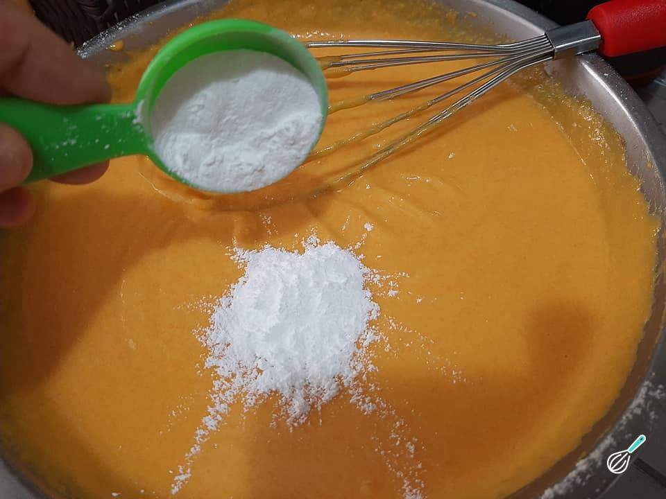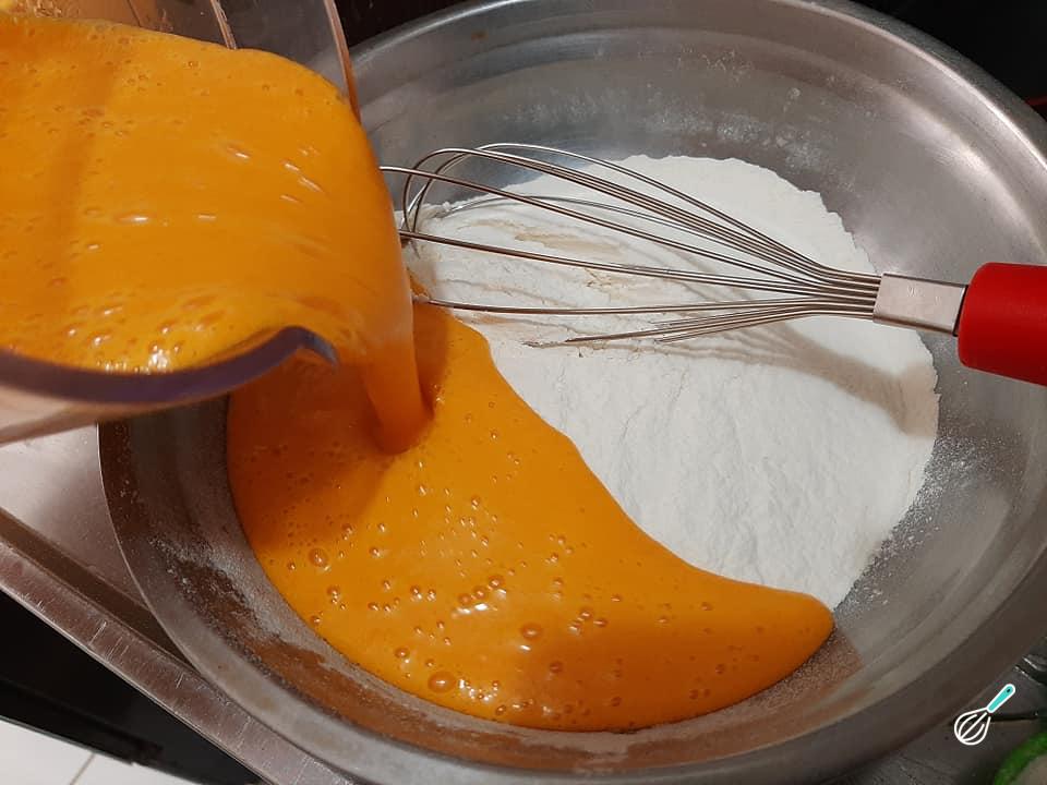 Despeje essa mistura num bowl com a farinha de trigo peneirada e misture com o auxílio de um fouet até que fique liso e homogêneo.