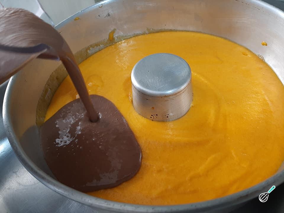 Dica: Não se preocupe se parecer que as receitas se misturaram. Seguindo as instruções corretamente, você verá que o bolo e o brigadeirão irão se separar na forma quando estiver assando.