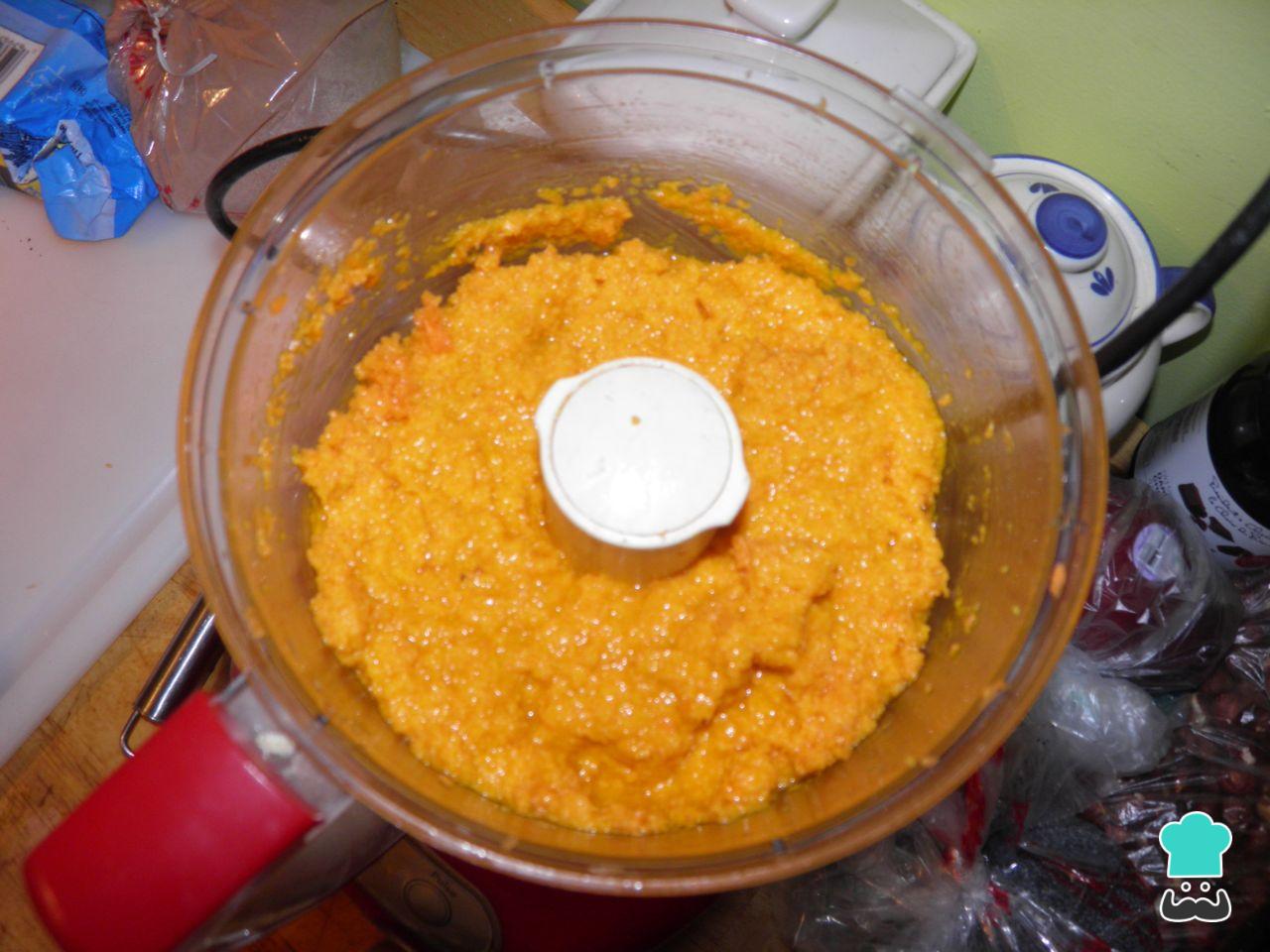 O primeiro passo deste bolo de cenoura diferente é bater a cenoura e os ovos no liquidificador ou processador. Acrescente a maionese (que pode ser maionese caseira ou industrializada) e o açúcar e volte a bater, até misturar muito bem.