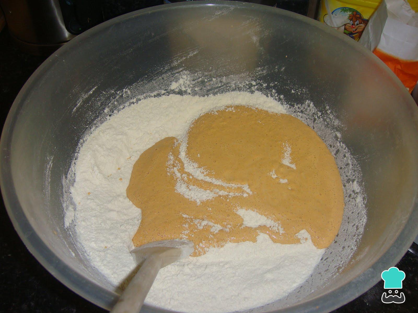 Numa tigela coloque a farinha e a maisena peneiradas. Acrescente a massa do liquidificador e misture tudo muito bem.