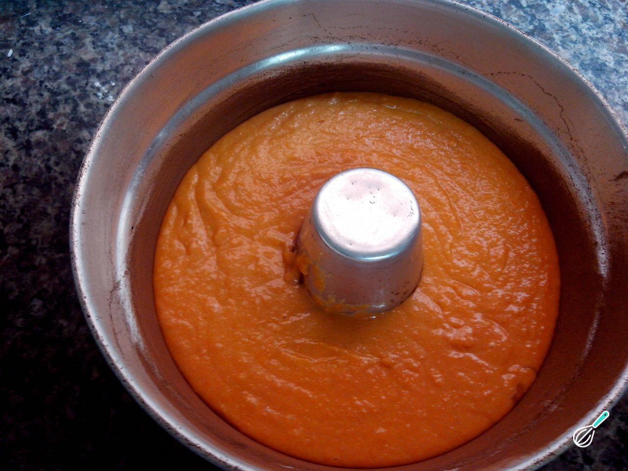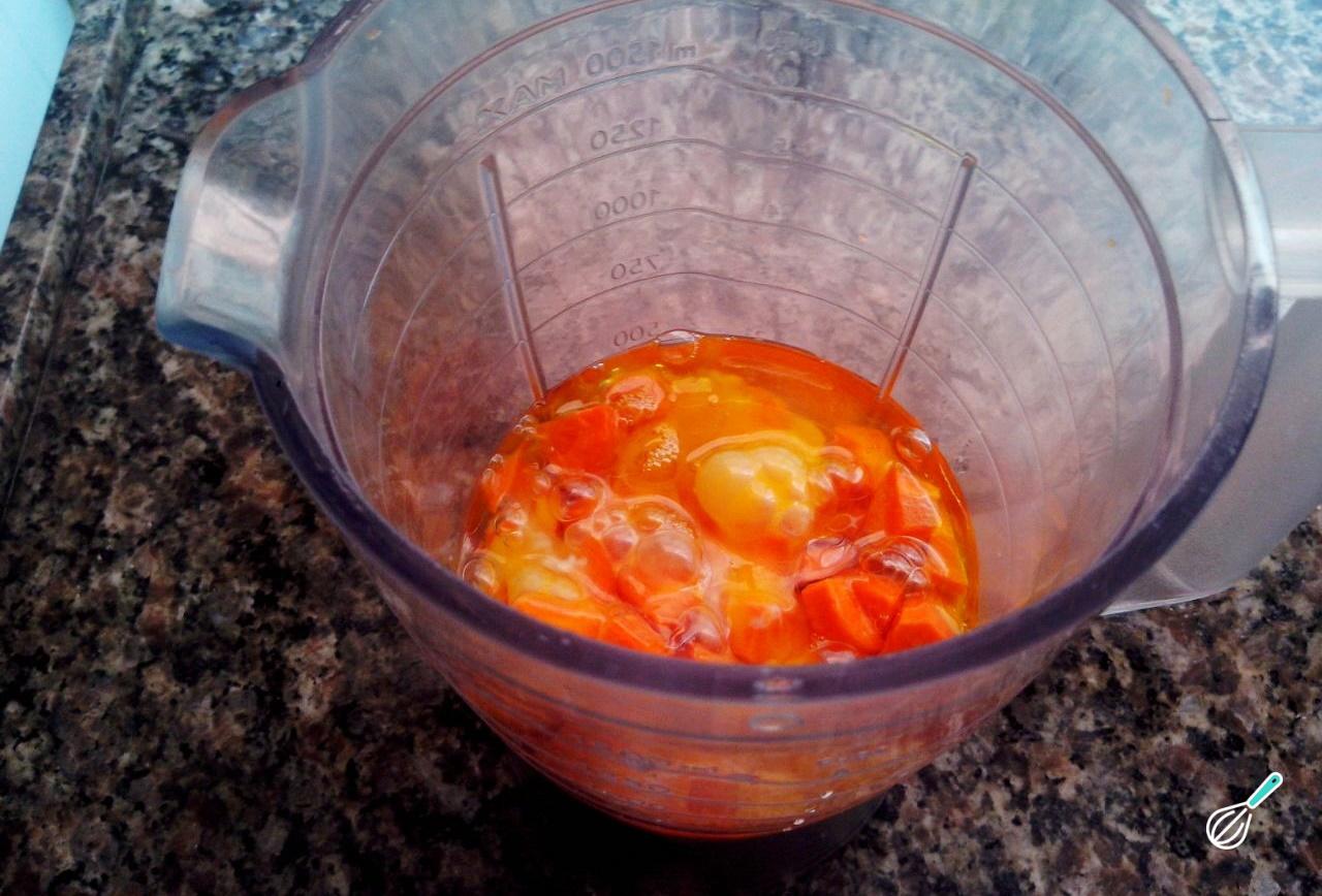 Prepare esta receita de bolo de cenoura fit com aveia batendo no liquidificador as cenouras picadas, o óleo de coco e os ovos até virar um purê.