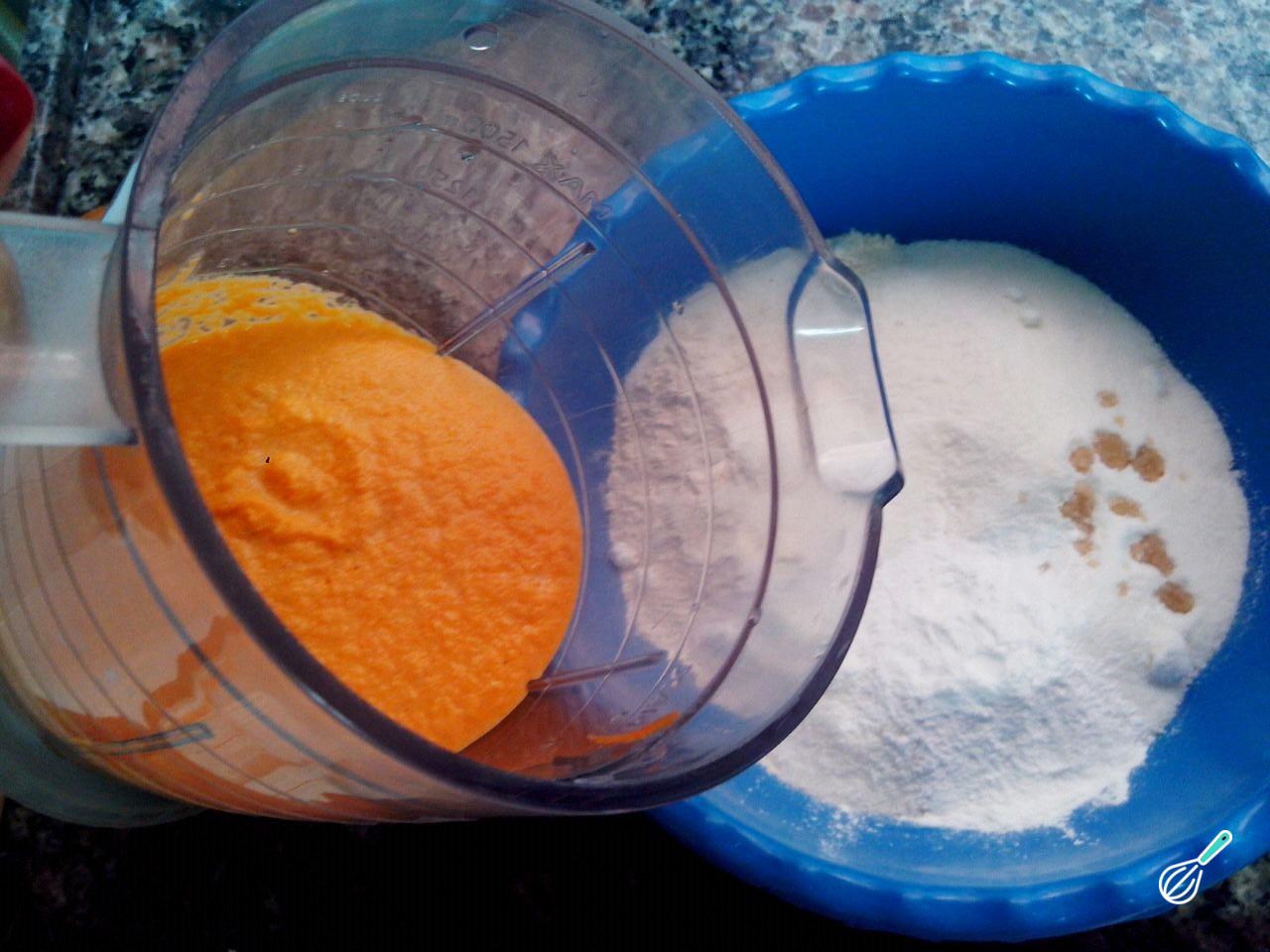 Em seguida coloque a farinha, o xylitol, a baunilha e o fermento num recipiente. Junte com a mistura do liquidificador e misture bem.