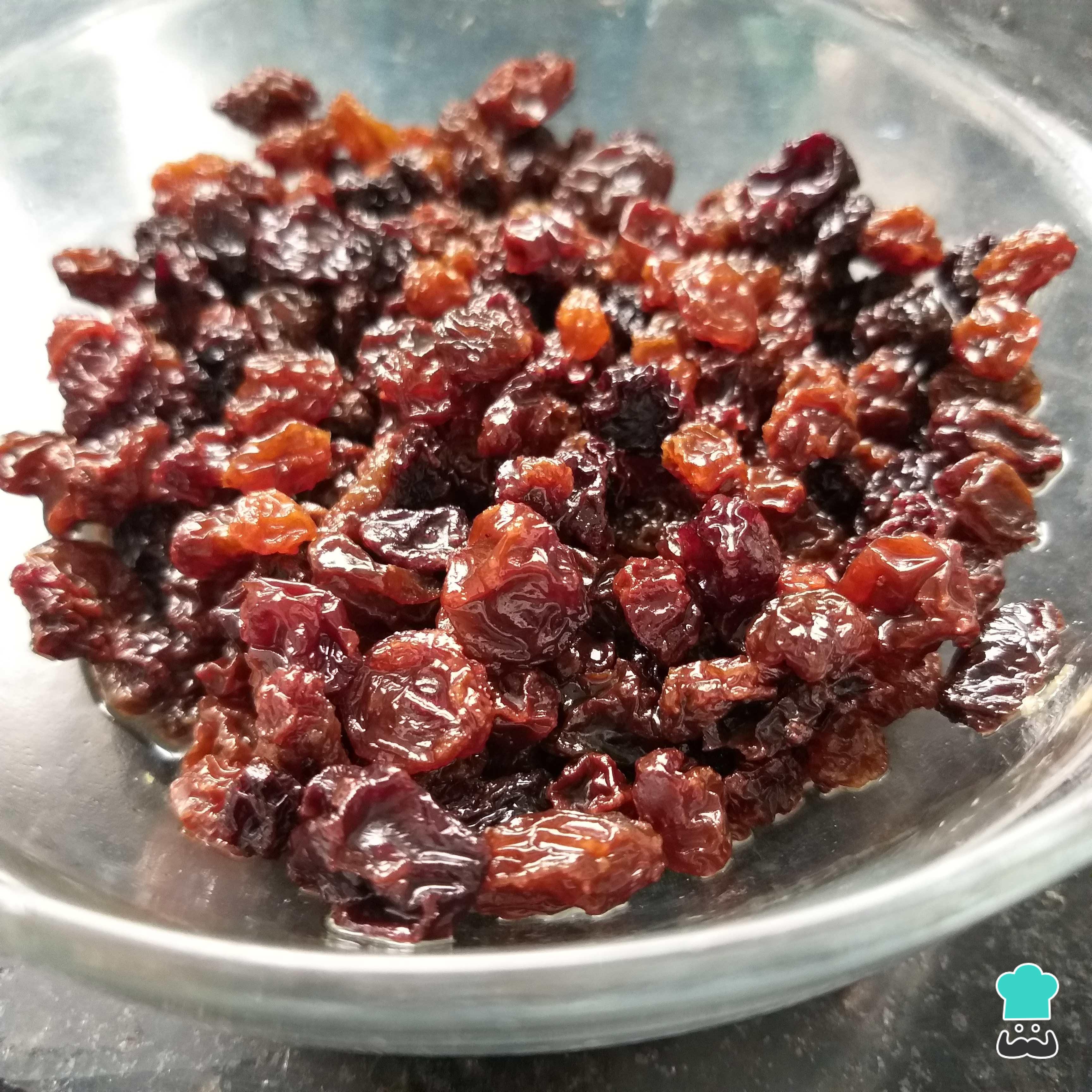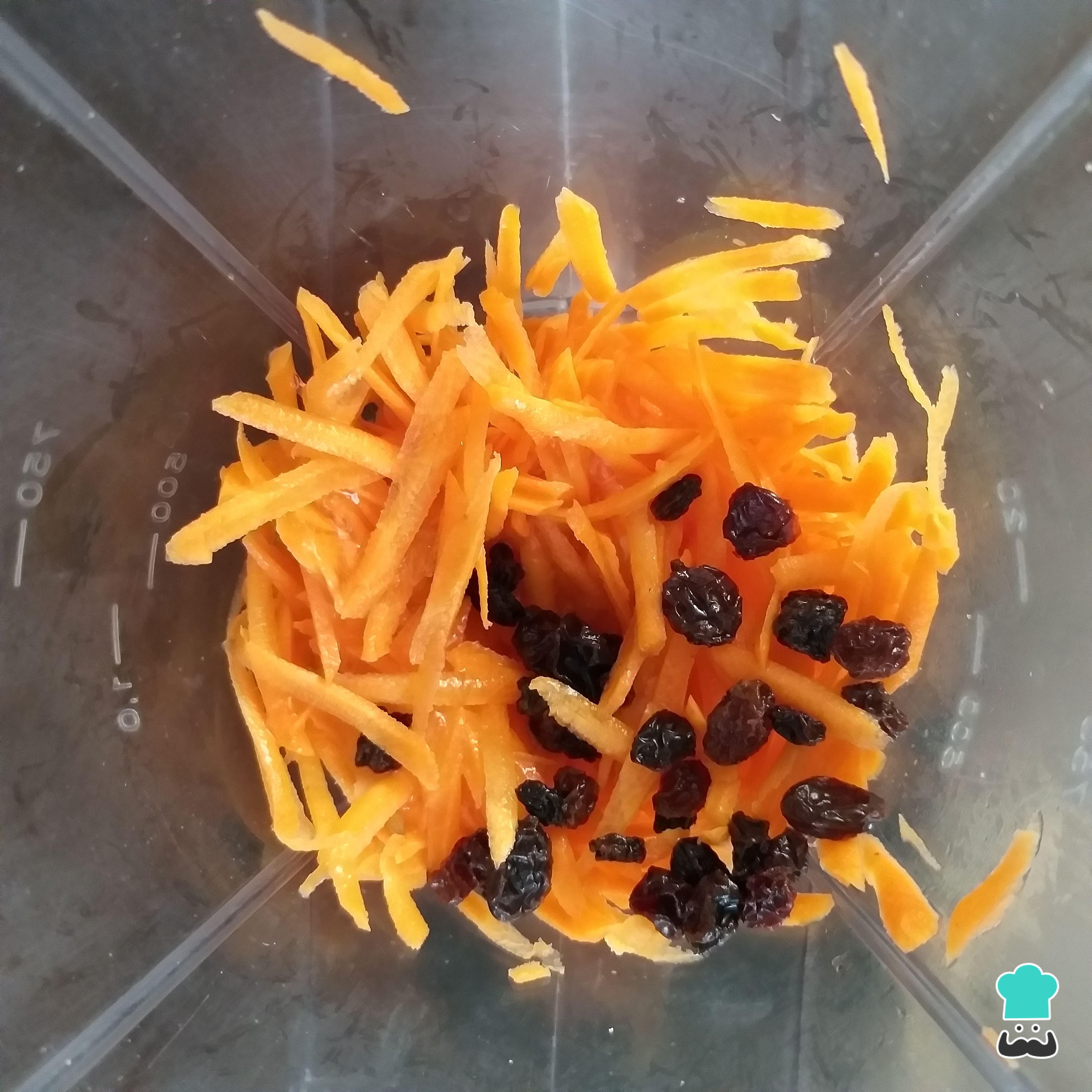 O primeiro passo para preparar este bolo de cenoura adoçado com uva passa é misturar as uvas passas com a água e levar ao microondas por 30 segundos. Se você não quiser usar o microondas, simplesmente deixe de molho por 15 minutos. No final, a uva passa deverá estar macia.