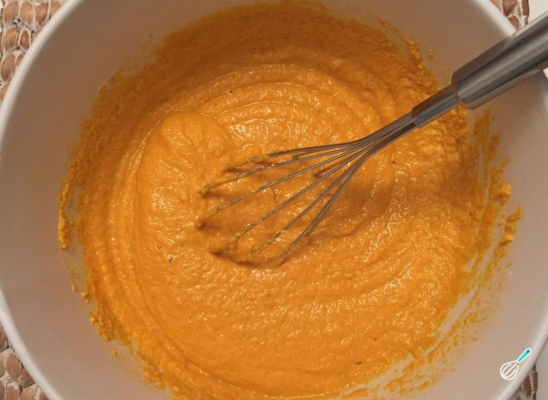 Coloque a mistura num bowl e junte a farinha de trigo e o açúcar. Mexa até ficar homogêneo e acrescente o fermento em pó.