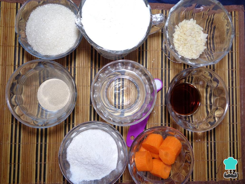 Comece separando os ingredientes necessários para o preparo deste bolo sem glúten, sem lactose e sem ovo. No caso estaremos usando farinha de amêndoas ou amêndoas moídas e amido de milho (maisena) para substituir o trigo e a água como substituta do leite.