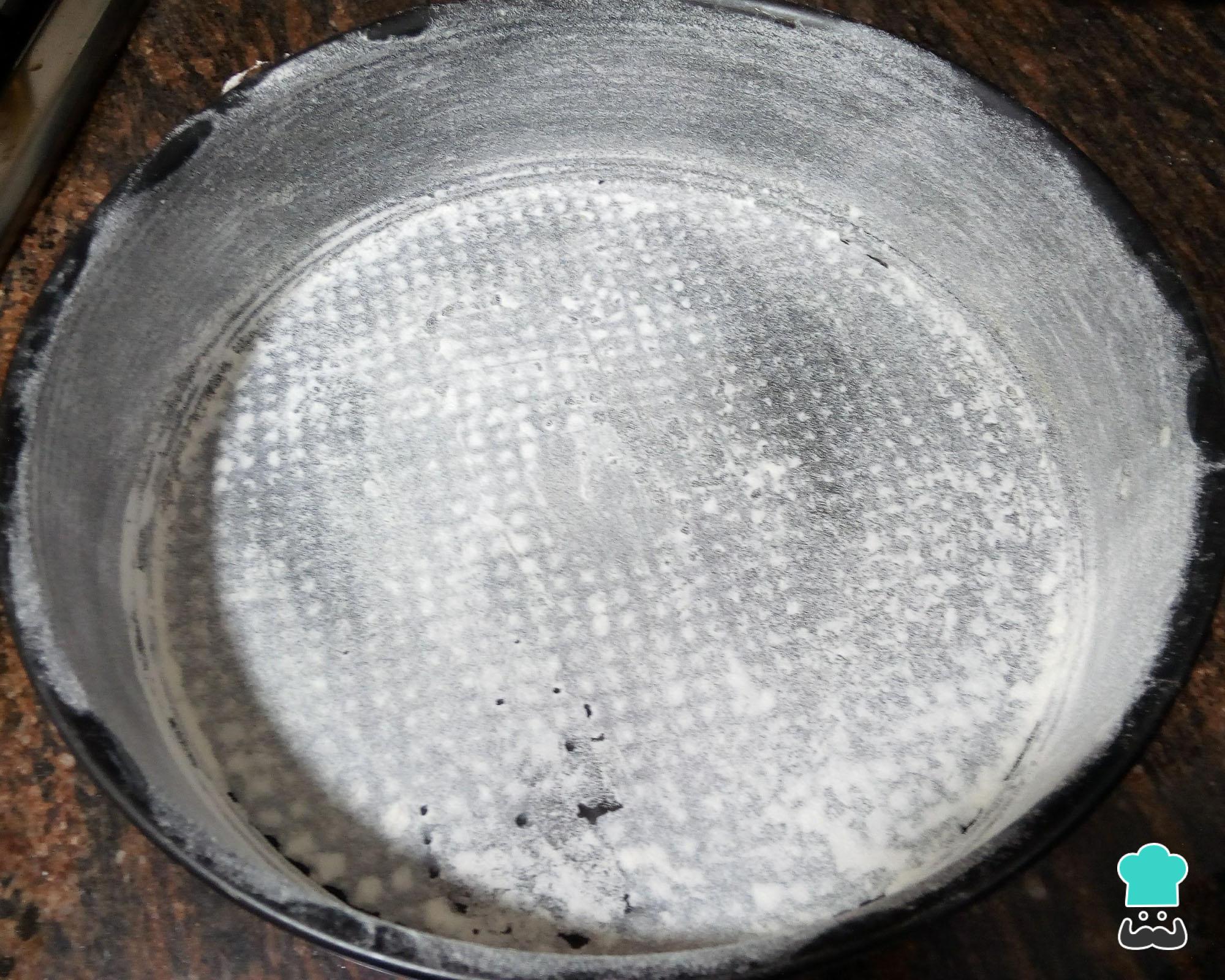 Em seguida pré-aqueça o forno nos 180ºC. Unte com óleo uma forma redonda de aproximadamente 20-22 cm e polvilhe bem com amido de milho. Se preferir, coloque papel toalha para assar bolo.