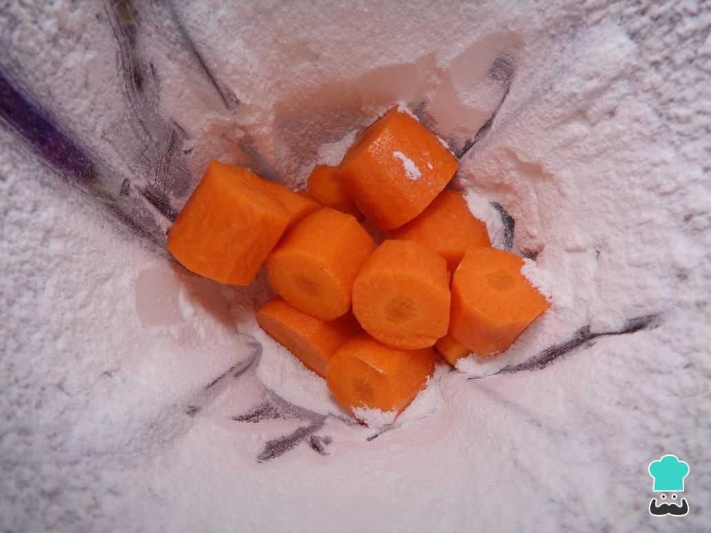 Descasque e pique as cenouras e coloque-as no liquidificador. Adicione também a água e bata até obter uma mistura uniforme, homogênea e sem grumos.