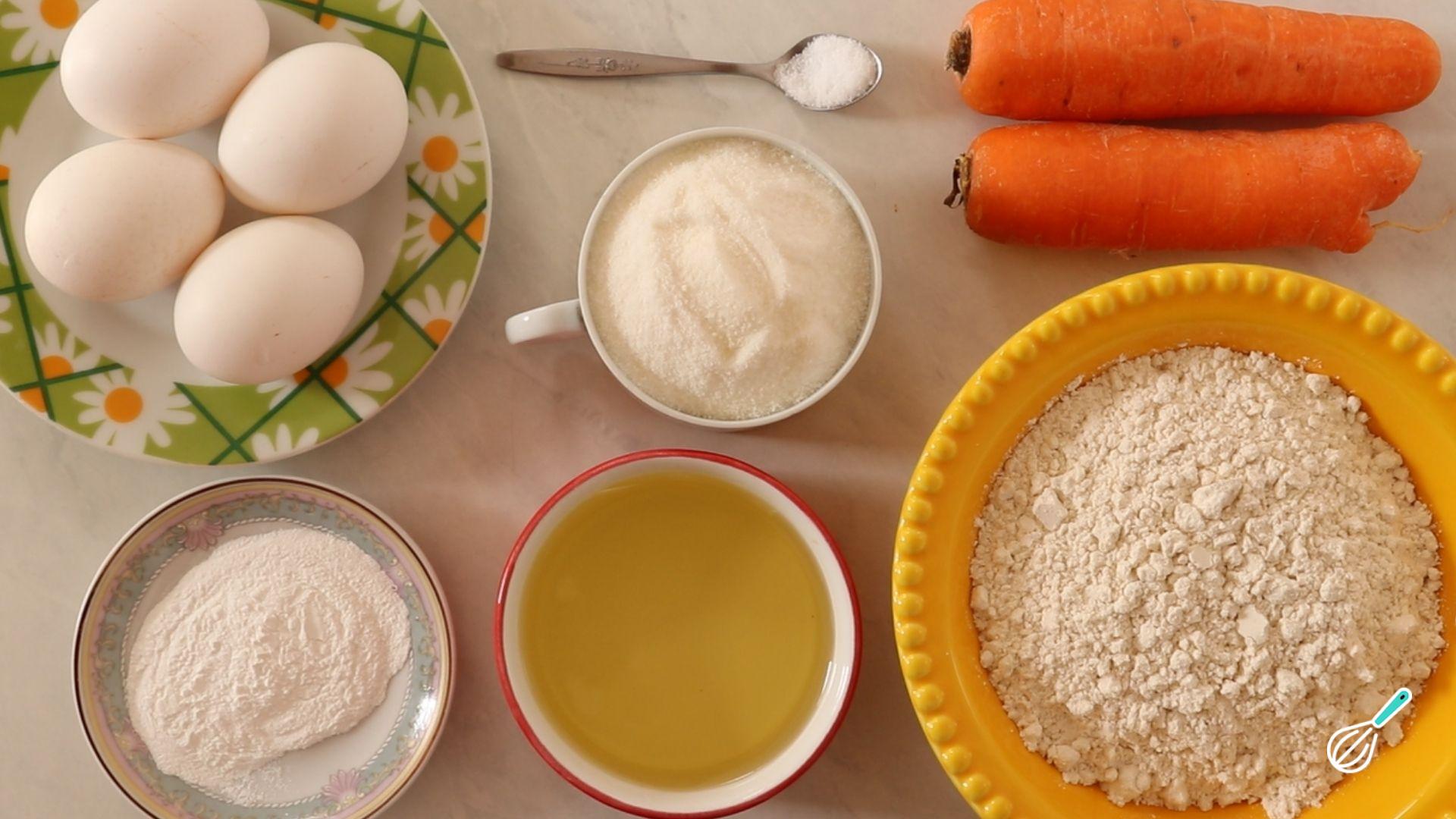 Separe os ingredientes do seu bolo de cenoura no palito. Descasque e corte a cenoura e deixe os ovos em temperatura ambiente.