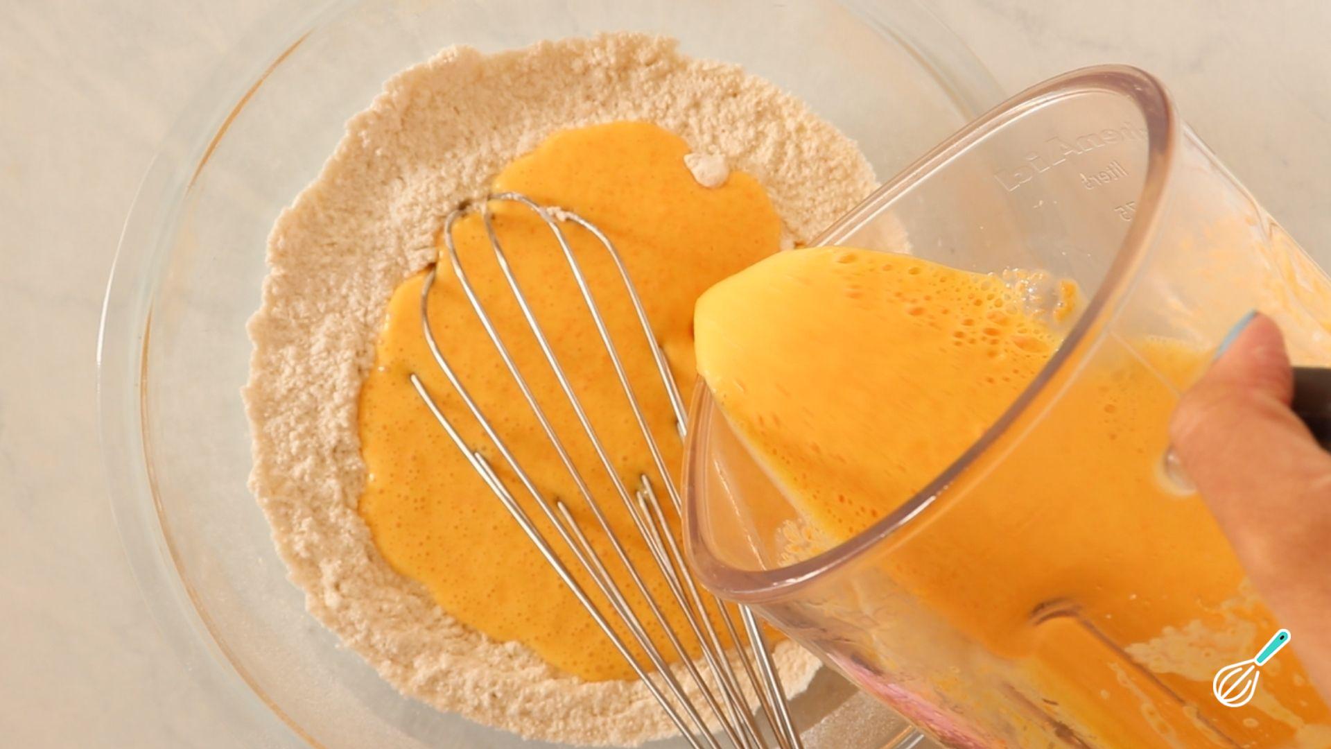 Despeje a mistura nos ingredientes secos e misture delicadamente.