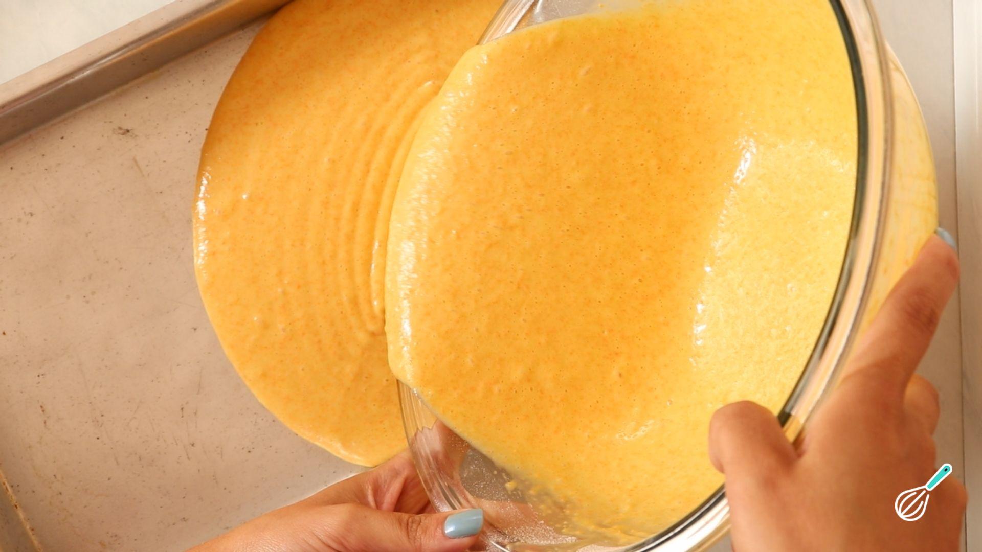 Despeje em uma forma retangular untada com manteiga e farinha (ou desmoldante), e asse o bolo em forno preaquecido a 180 graus por 40 minutos.