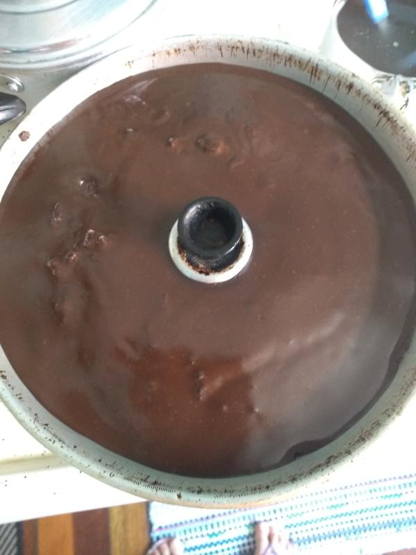 Enquanto isso prepare a calda de chocolate para bolo de cenoura: numa panela coloque todos os ingredientes (o chocolate ou cacau, o adoçante ou o leite) e deixe no fogo até ferver e engrossar, mexendo de vez em quando.