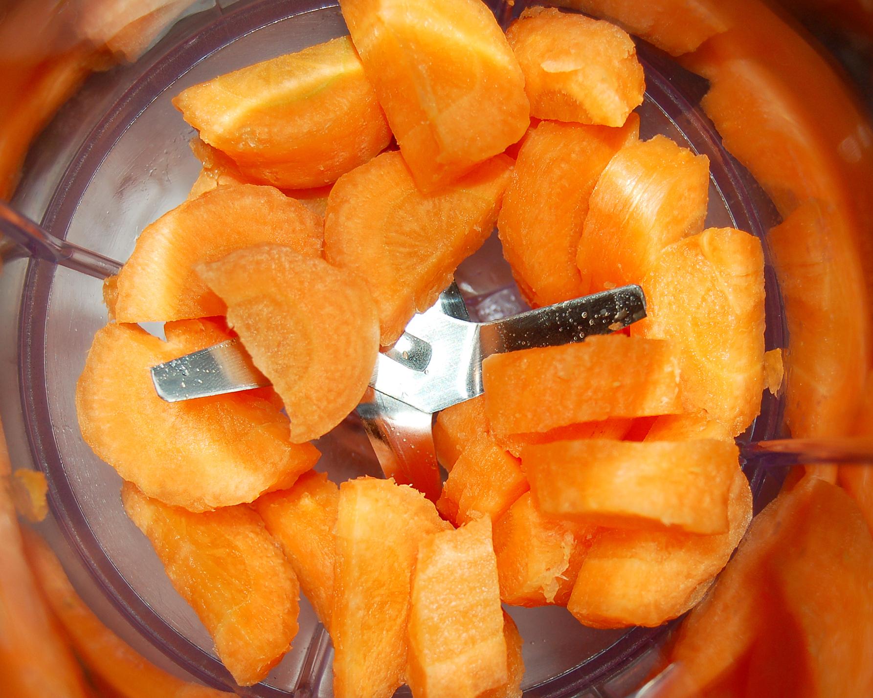 Coloque no liquidificador as cenouras descascadas e picadas e acrescente os ovos e o óleo. Bata até virar uma pasta. Numa tigela coloque os restantes ingredientes peneirados: a farinha de arroz, o adoçante e o fermento.