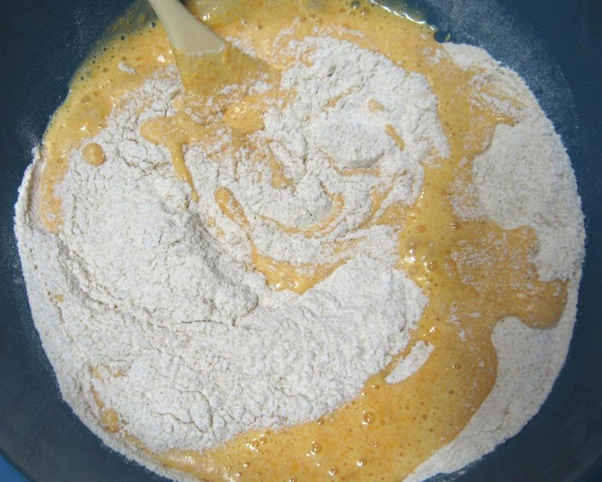 Coloque a mistura do liquidificador na tigela dos secos e misture tudo muito bem, envolvendo até que não sobrem grumos.