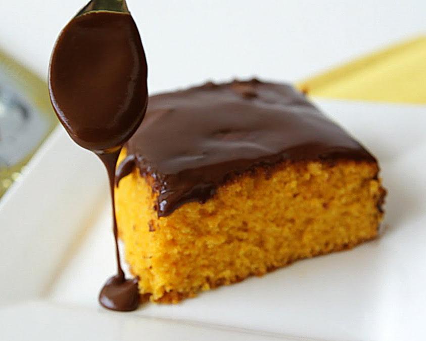 Quando o bolo estiver assado retire-o do forno e espere esfriar um pouco antes de desenformar. Depois desenforme, jogue a calda por cima dele e pode servir! Desfrute deste bolo de cenoura sem farinha de trigo e sem açúcar e diga nos comentários o que você achou. Bom apetite!