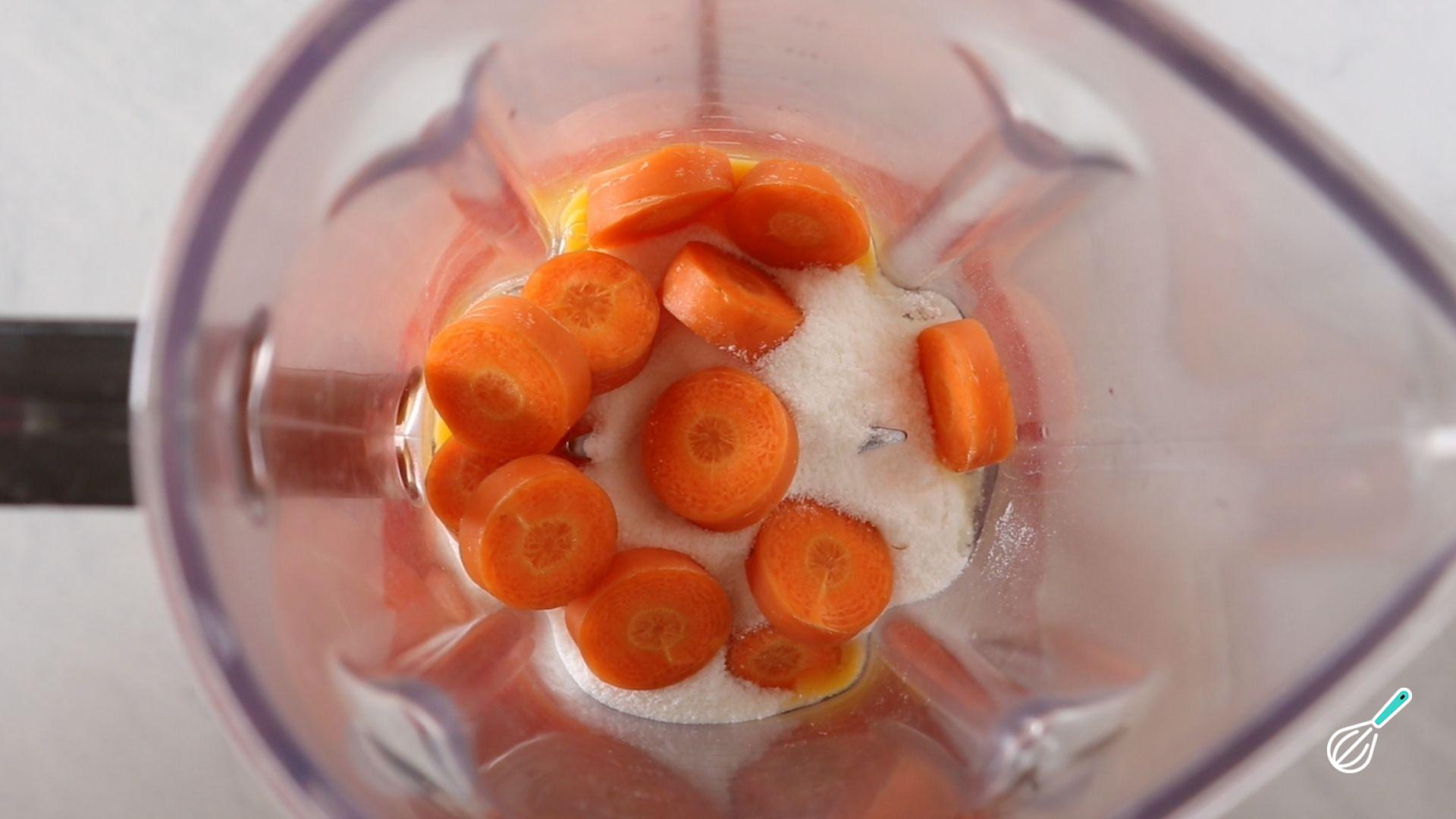 Bata bem no liquidificador: o ovo, o açúcar, a cenoura e o óleo.