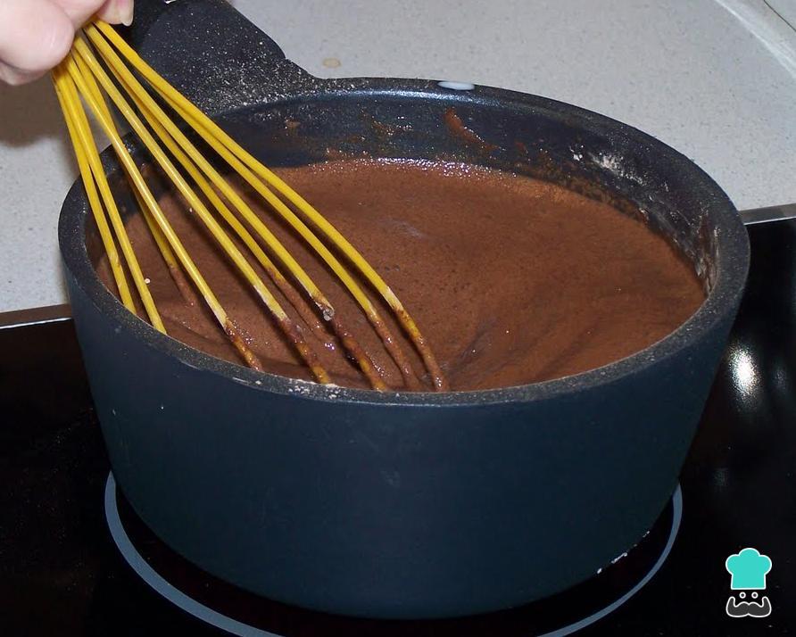 Para começar a preparar este bolo de chocolate, leve o leite ao fogo médio. Quando ferver, acrescente o cacau em pó e mexa muito bem, para dissolver. Desligue o fogo e deixe esfriar.