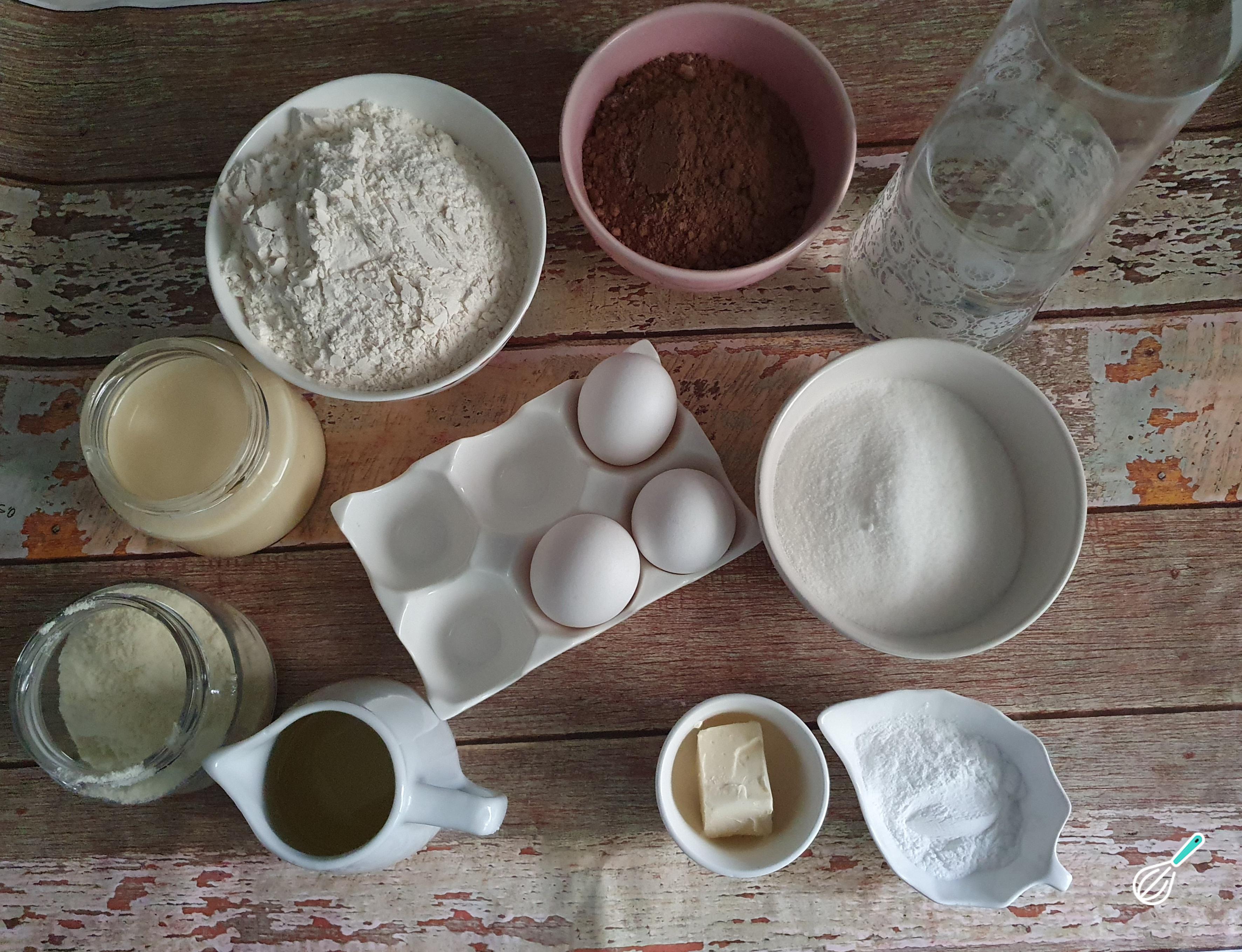 Comece separando os ingredientes que você vai usar nessa receita de bolo de chocolate com brigadeiro branco.