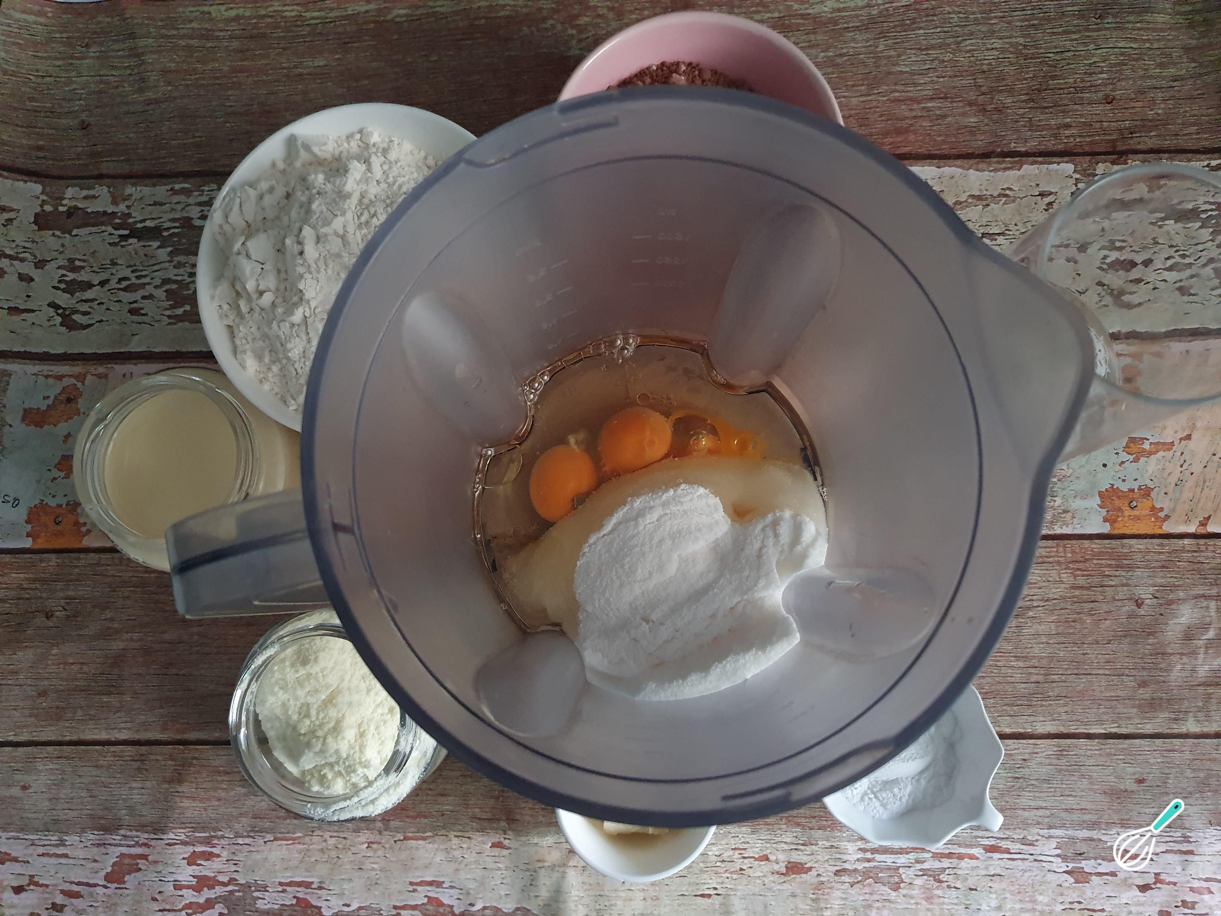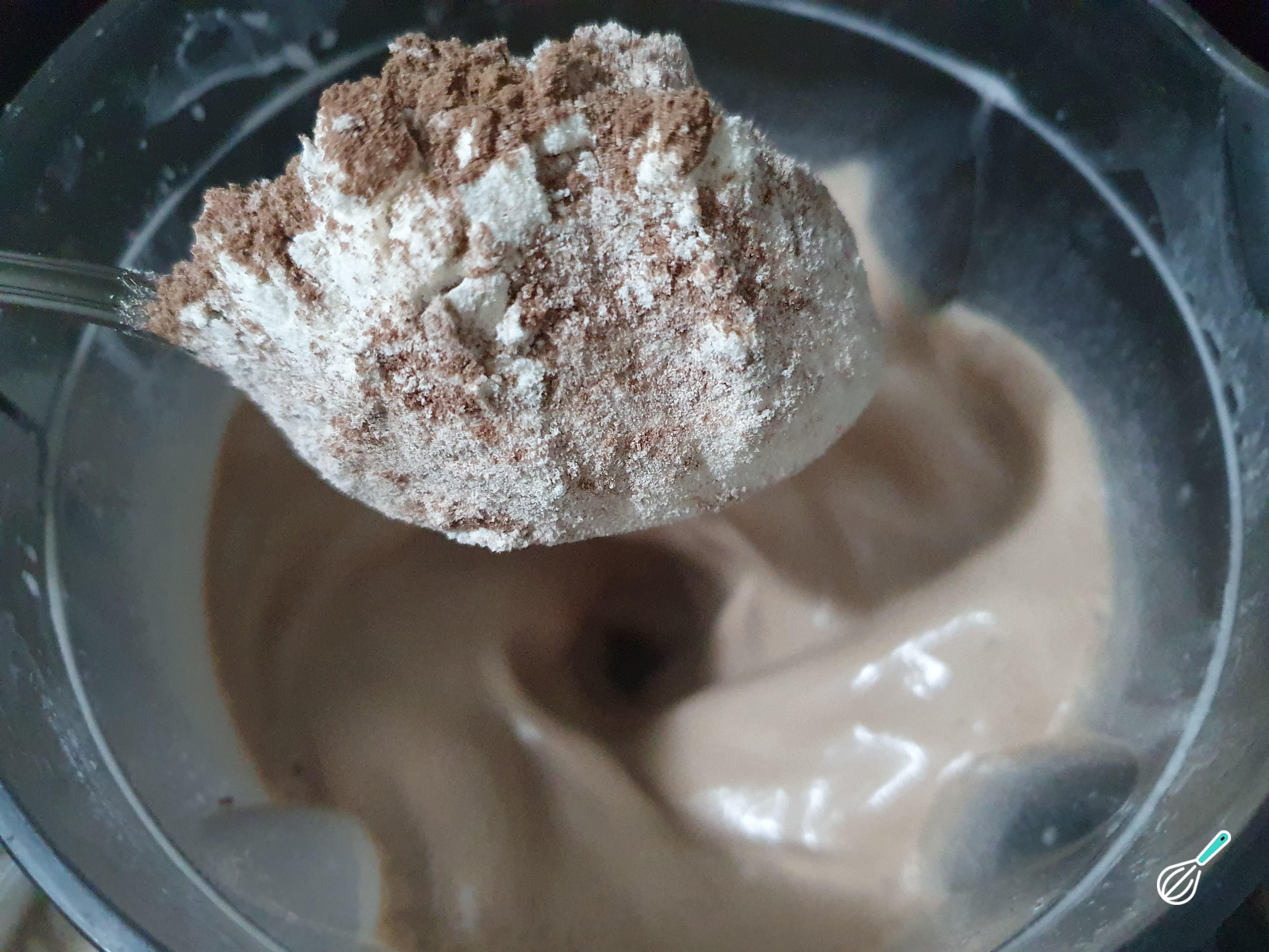 Depois que a mistura do liquidificador ficou branquinha, vá colocando aos poucos a mistura da farinha e do chocolate e bata bem.