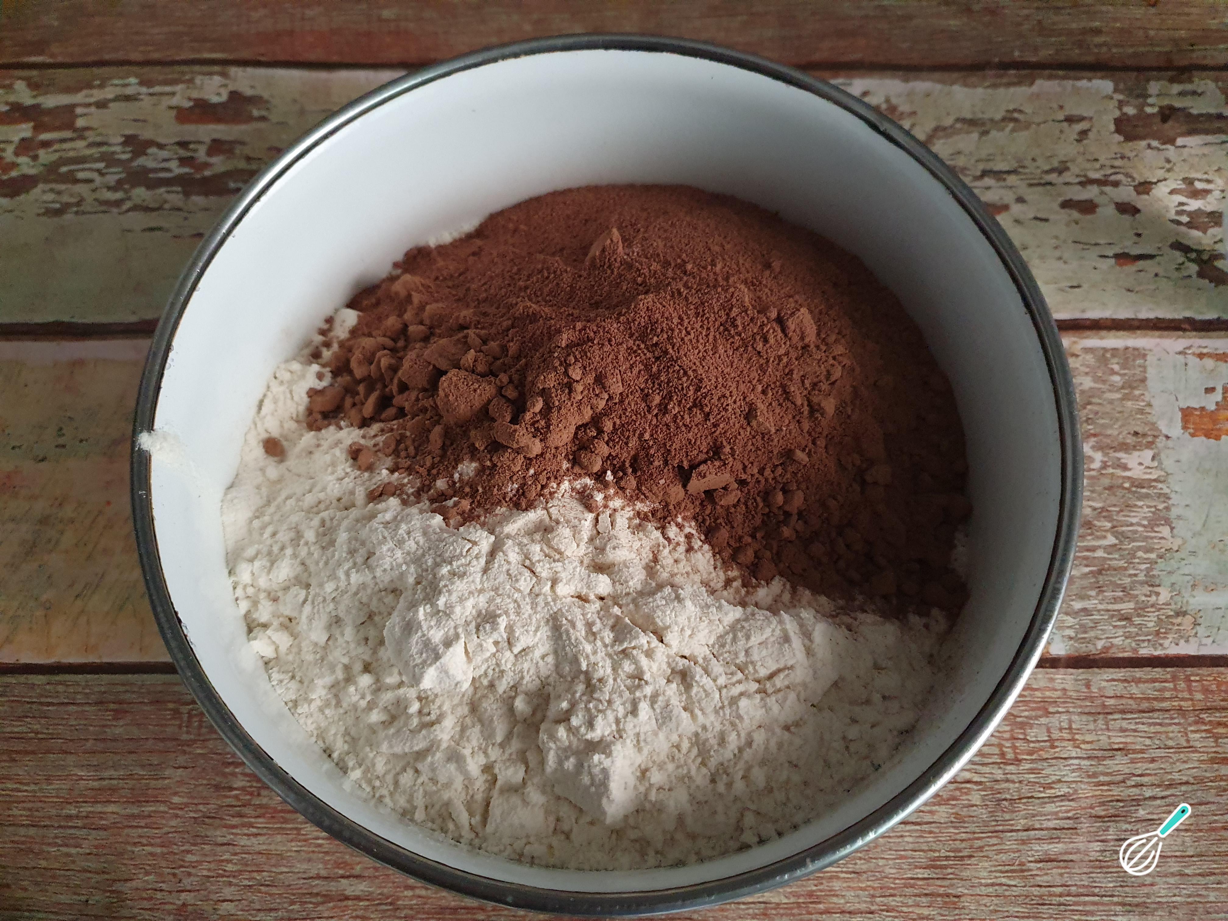 Coloque em uma vasilha a farinha, o chocolate em pó e o sal.