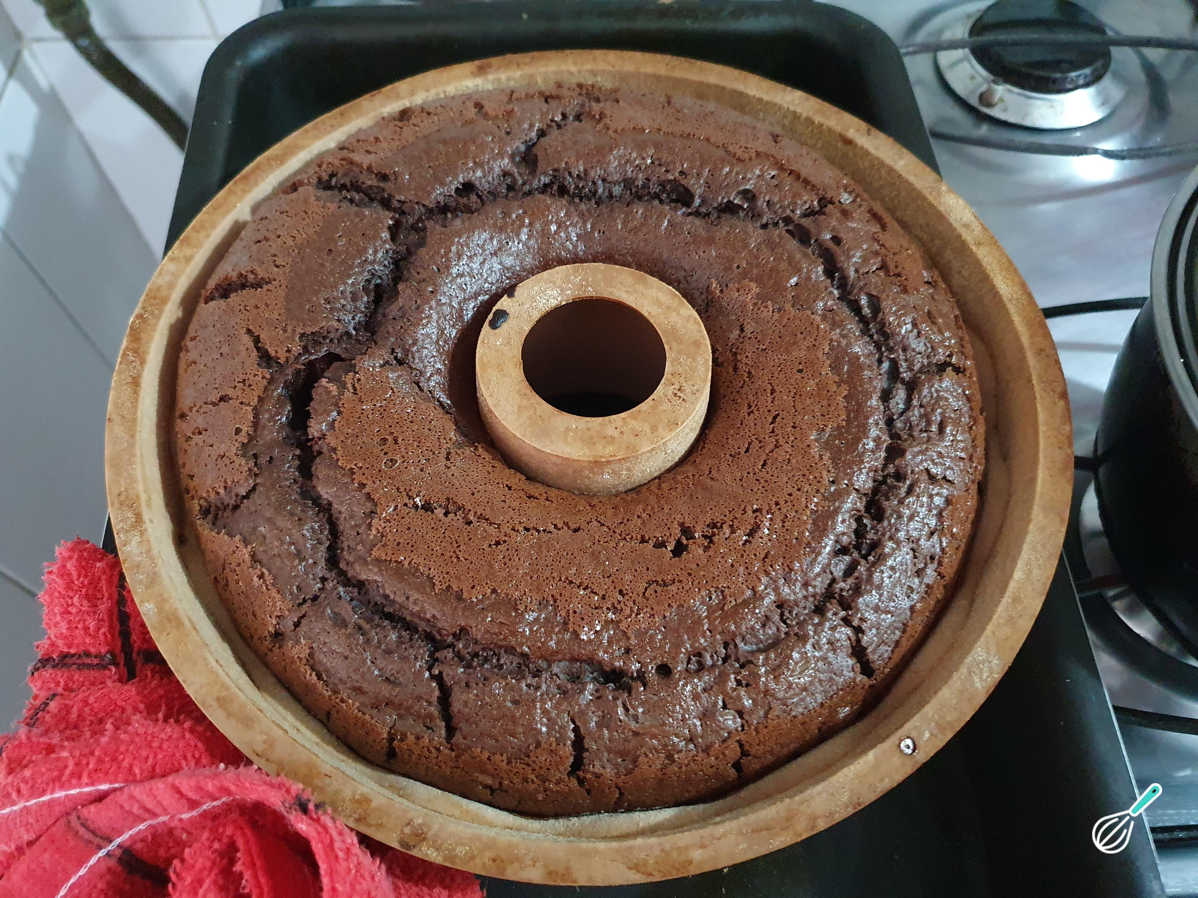 O ponto é de brigadeiro de colher, ainda quente despeje sobre o bolo.