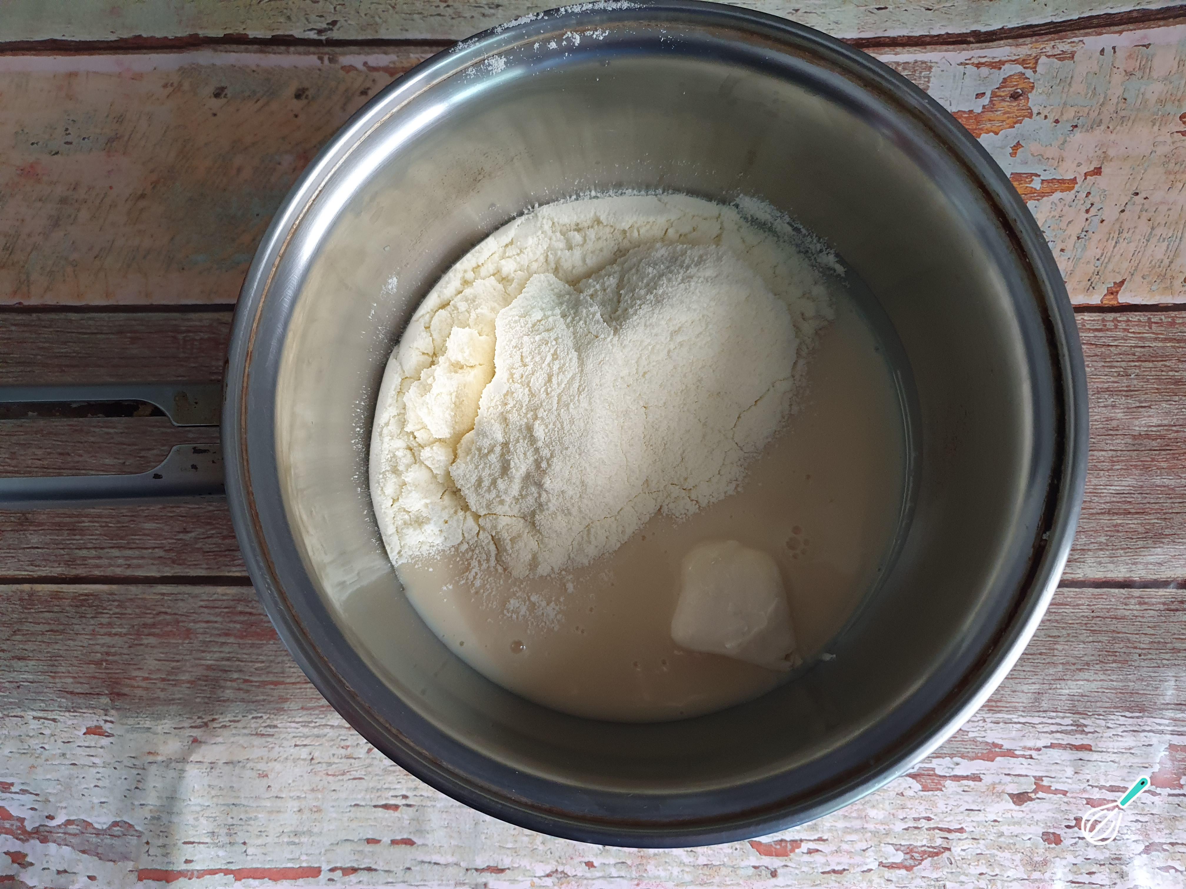 Leve ao fogo baixo uma panela com o leite condensado, o leite em pó, a manteiga e o chocolate branco.