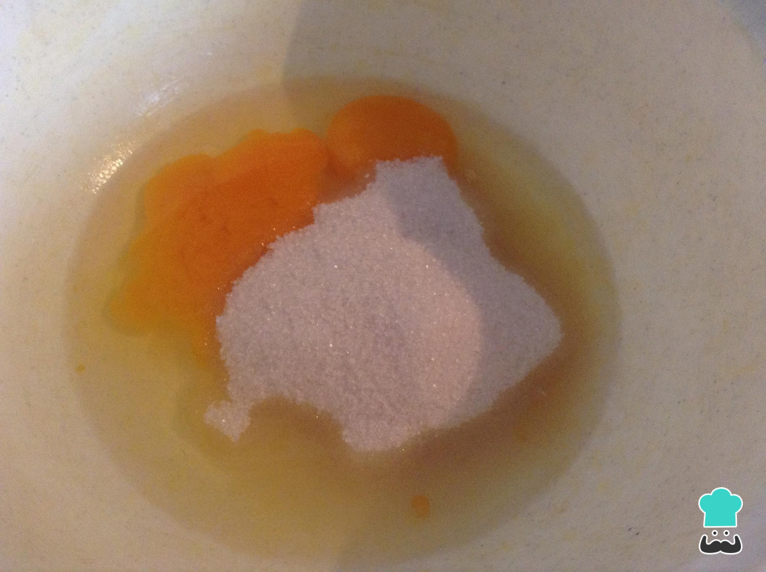 Em uma tigela misture os ovos e o açúcar, de preferência com um batedor de claras, até obter um creme esbranquiçado. Acrescente o rum e a essência e volte a bater.