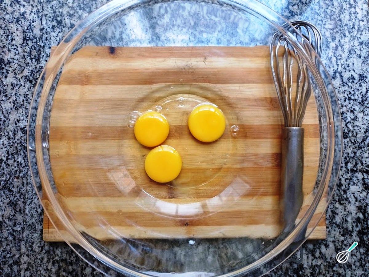 Numa tigela, coloque os ovos inteiros. É importante quebrar cada um separadamente, para certificar que não estão estragados e, assim, não perder toda a receita.