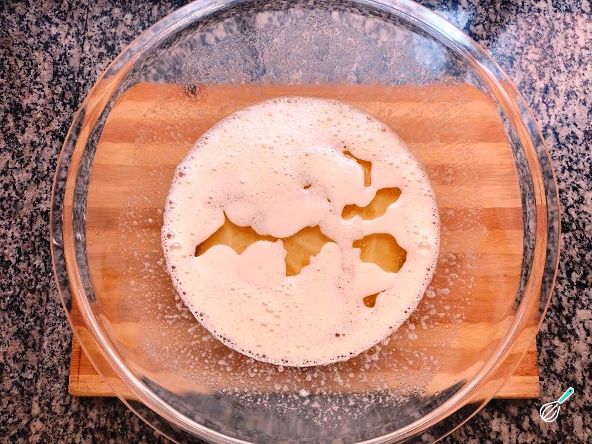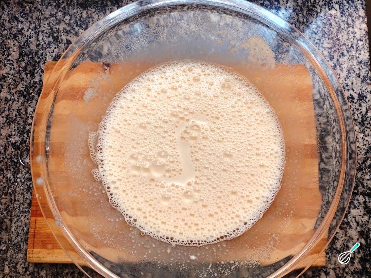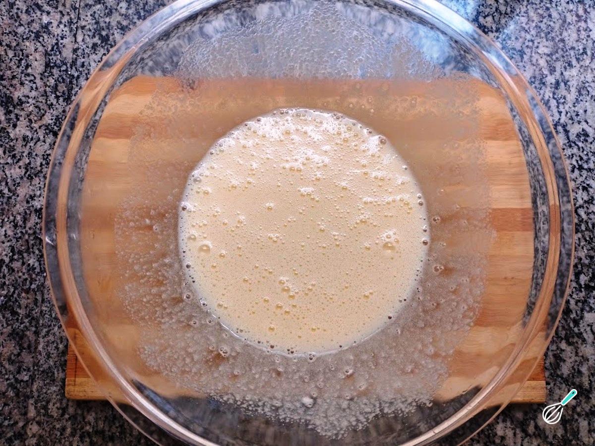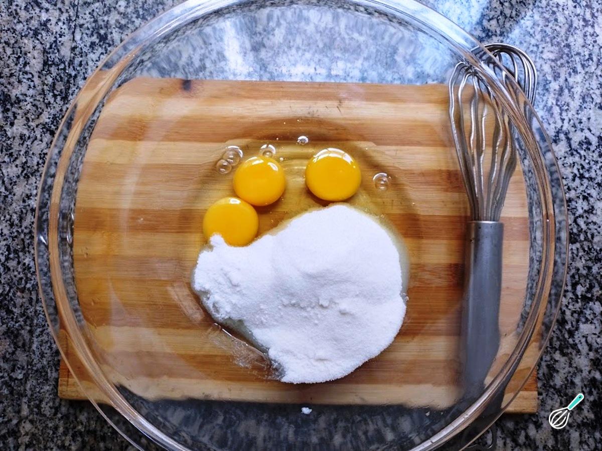 Com auxílio de um fouet, bata a mistura de ovos com açúcar, até formar uma massa branca e aerada.