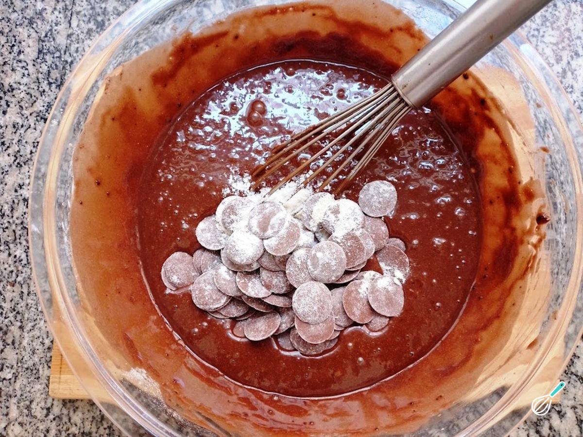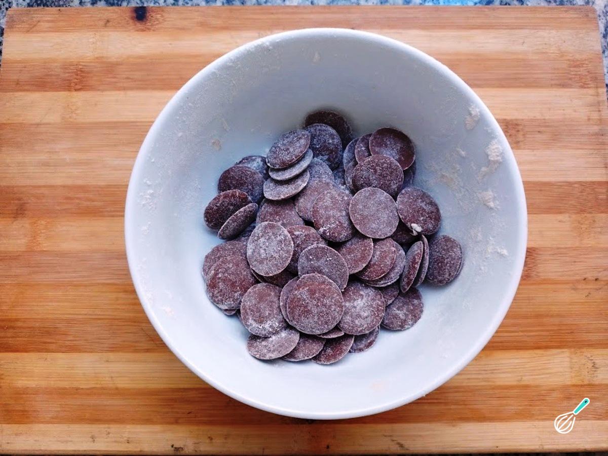Misture as gotas de chocolate com 1 colher de sopa de farinha de trigo. Isso ajuda a gostas de chocolate a não descer na massa e ficar melhor distribuídas.