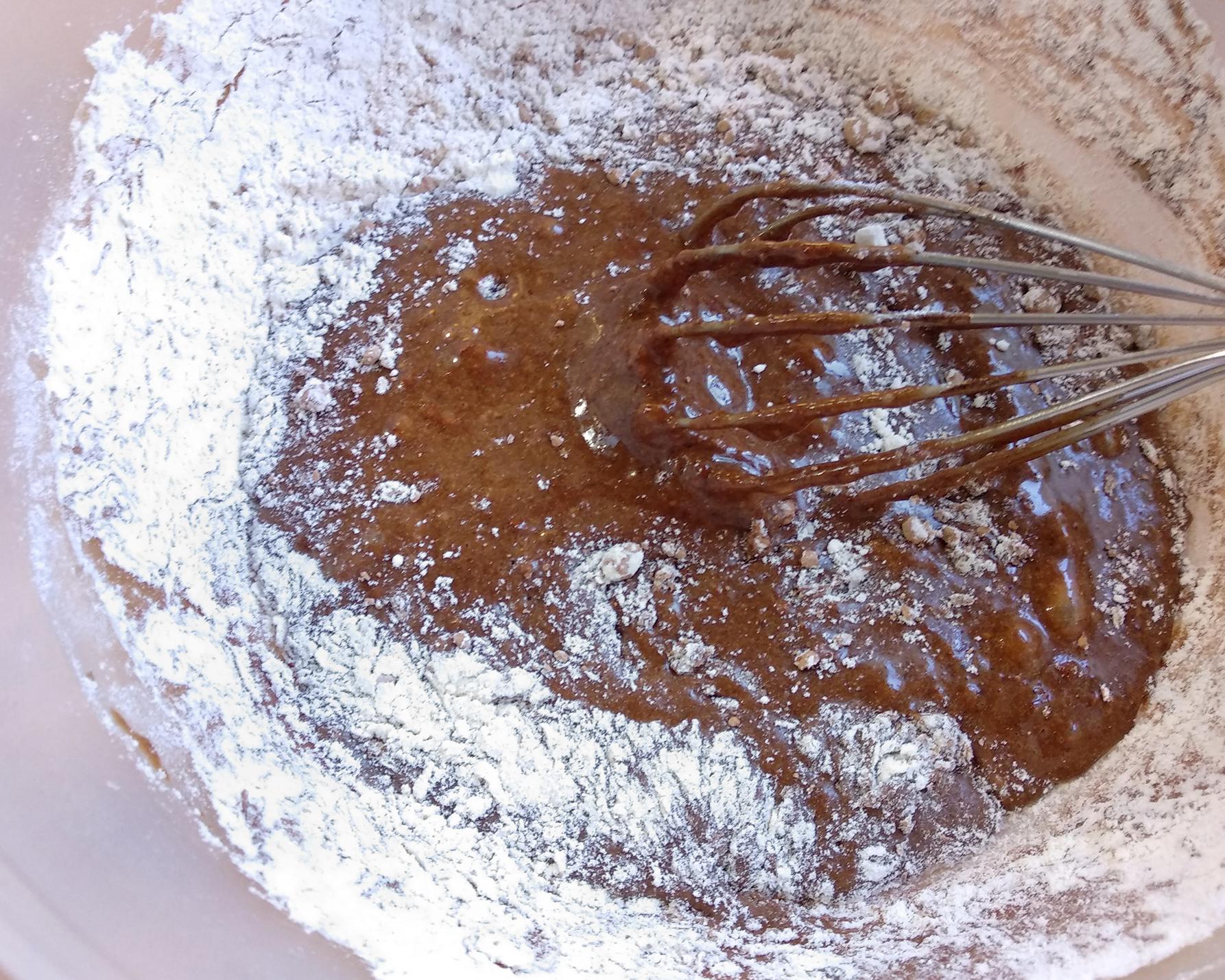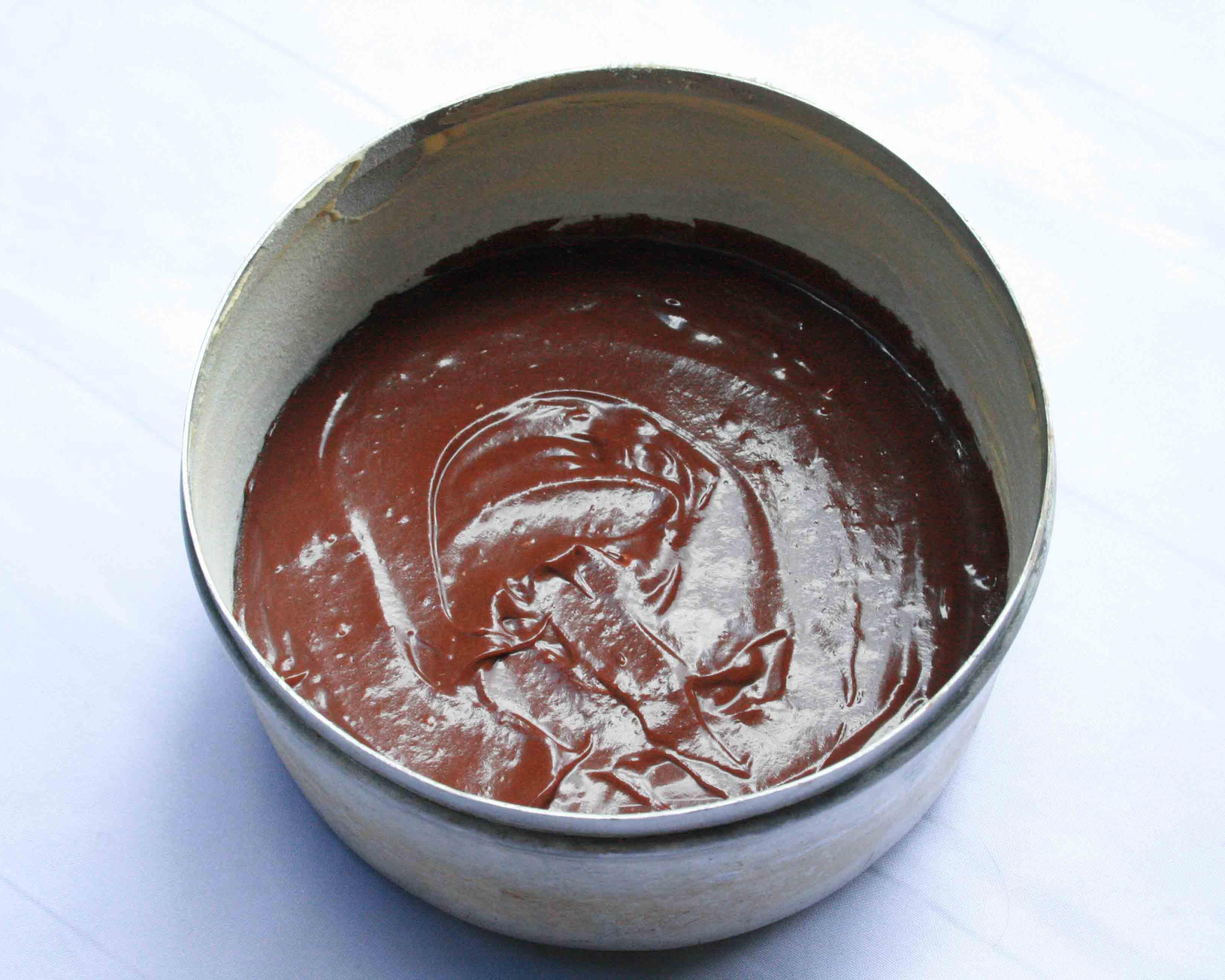Ligue o forno nos 180ºC. Numa tigela bata os ovos com a manteiga e o açúcar do bolo de chocolate até virar um creme suave. Coloque o cacau ou chocolate peneirado e bata para incorporar.