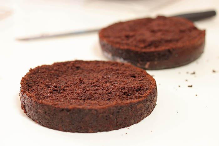 Quando o bolo de chocolate estiver pronto retire do forno e deixe esfriar por uns 10 minutos. Depois desenforme, corte em duas metades iguais e coloque a mousse de maracujá numa das metades. Cubra com a outra metade de bolo e reserve.